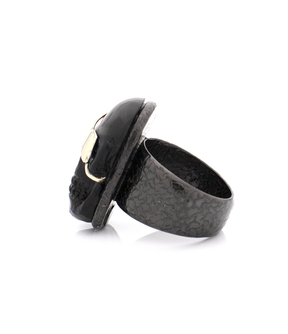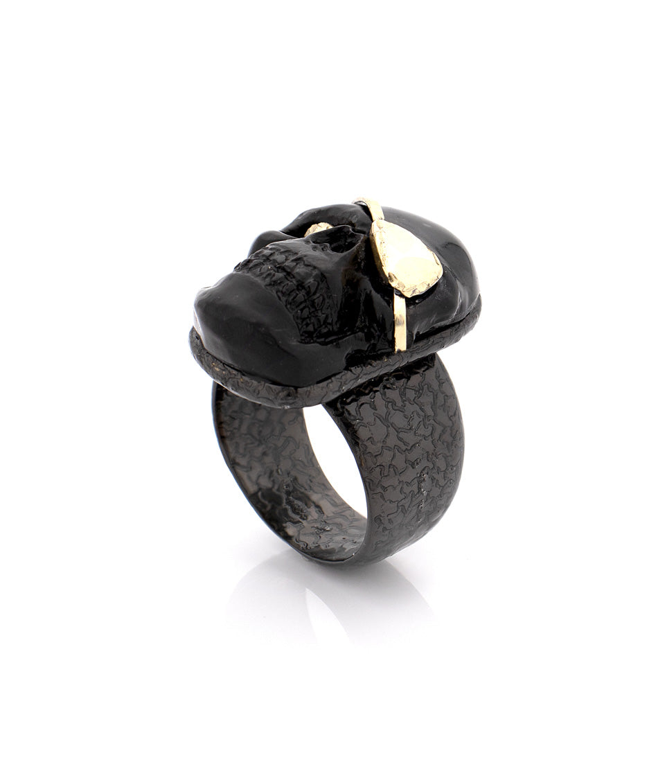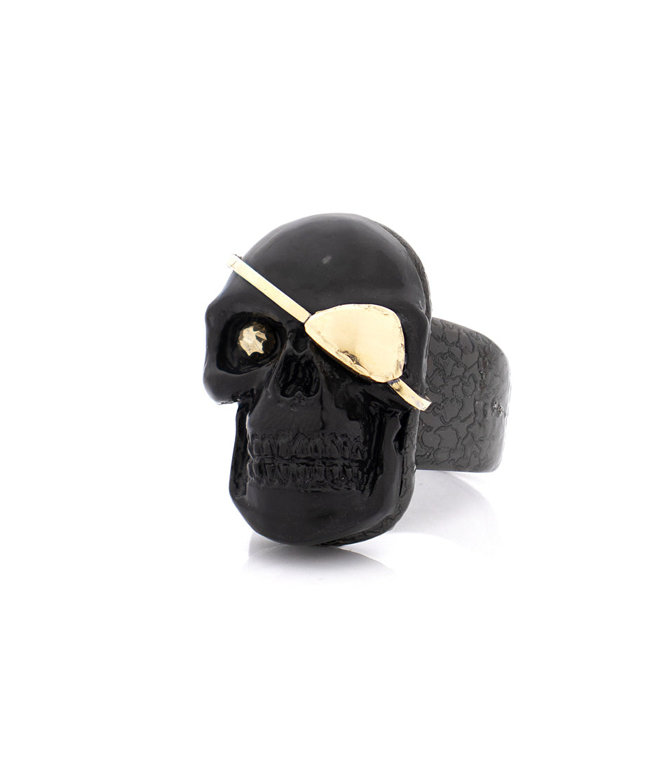 Audace e iconico: l'anello con teschio nero e benda sull'occhio dorata