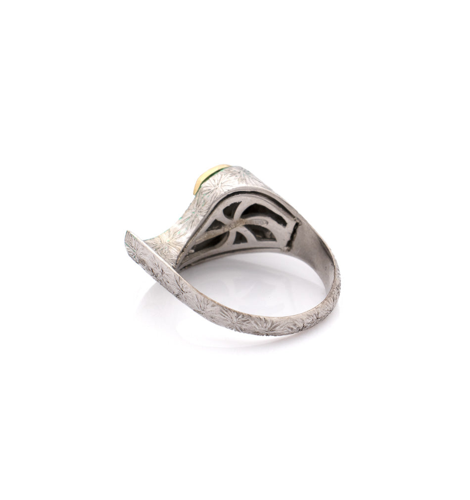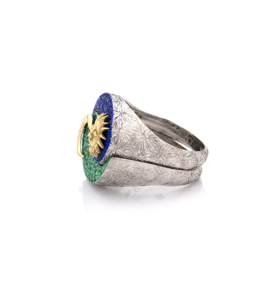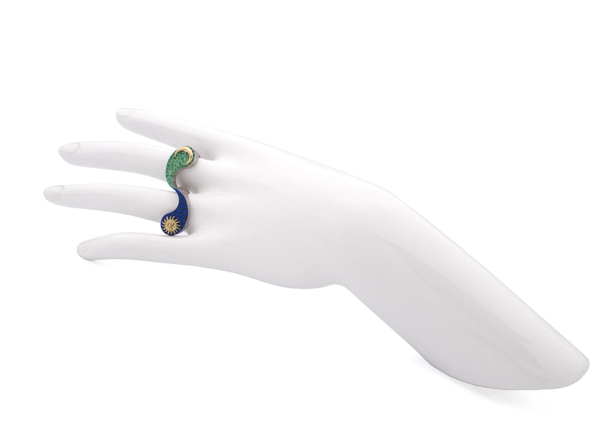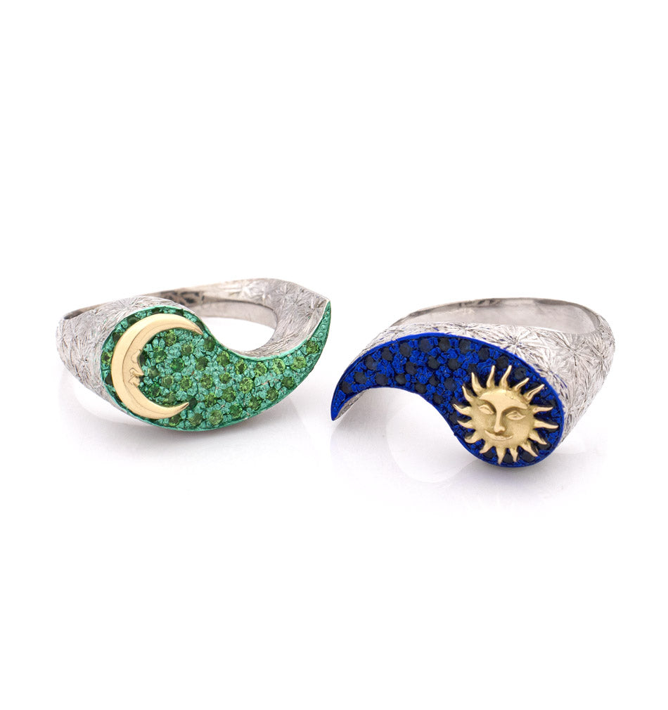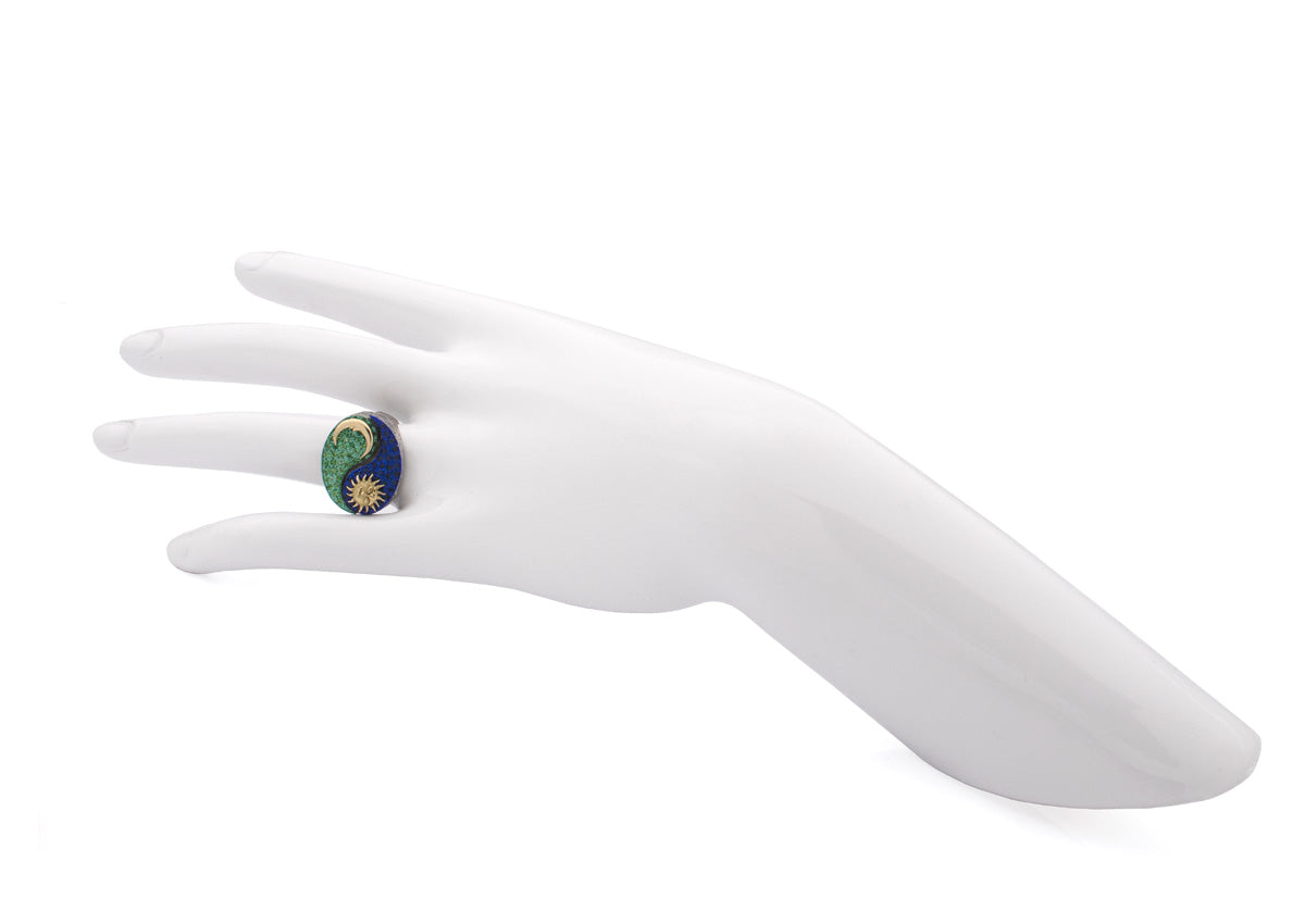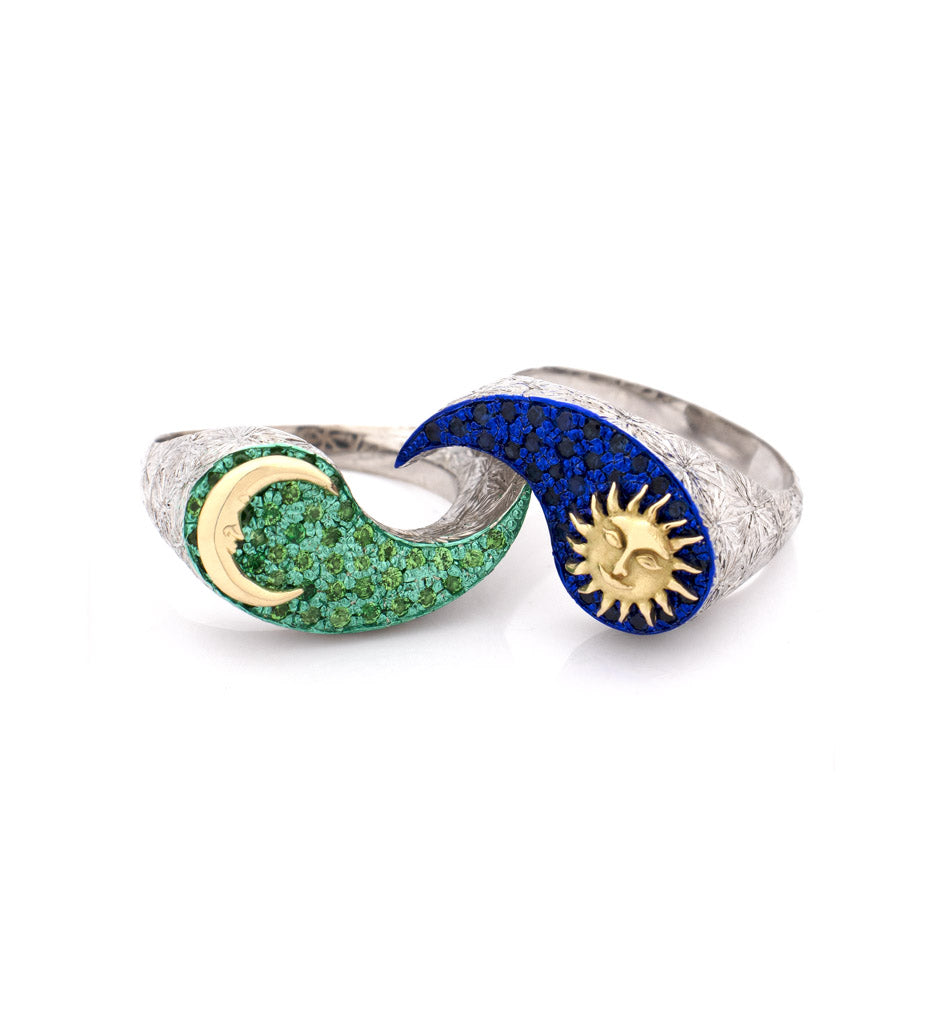 Il primo anello presenta una luna crescente dorata incastonata su un campo di pietre verdi brillanti, a simboleggiare la calma della notte, mentre il secondo anello mette in risalto un sole dorato luminoso circondato da gemme blu abbaglianti, a simboleggiare la brillantezza della luce del giorno. I due anelli insieme formano un armonioso disegno yin-yang, una potente dichiarazione di equilibrio, dualità e interconnessione dell'universo.