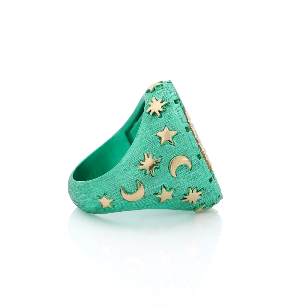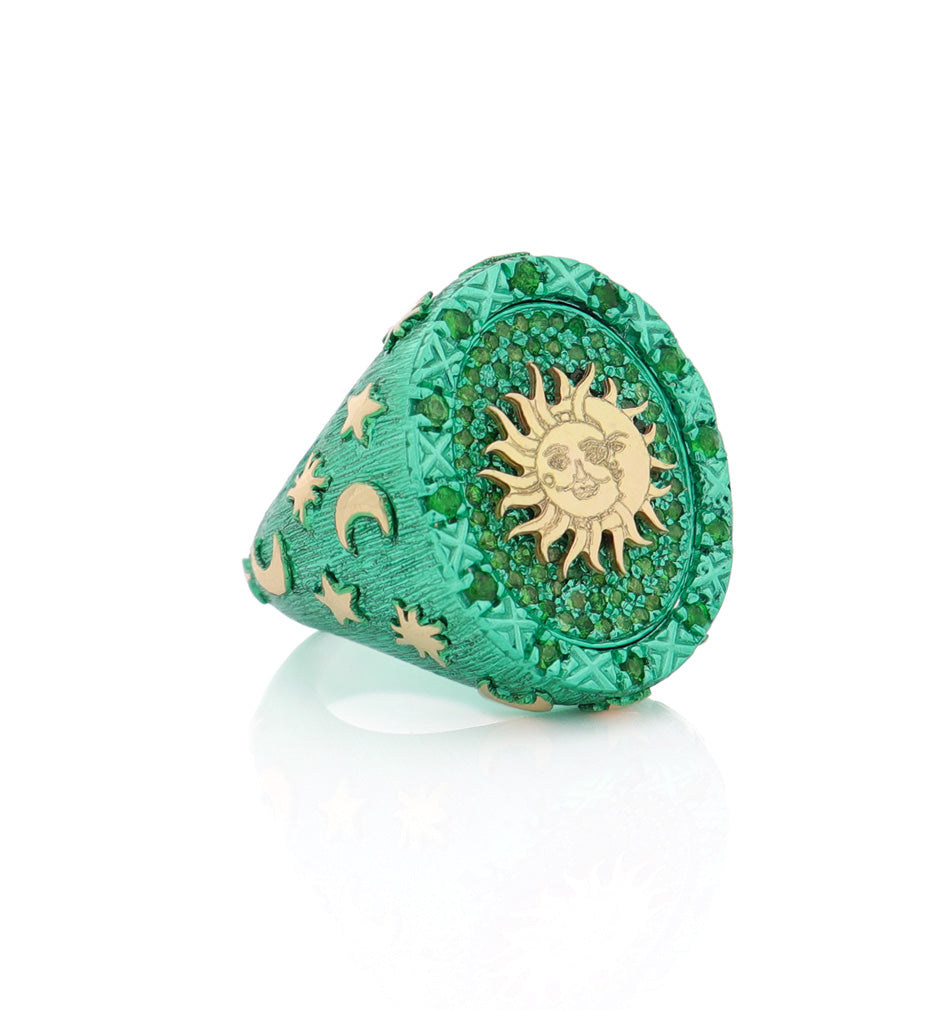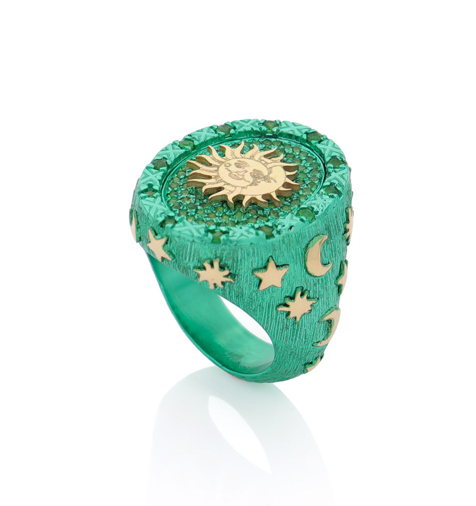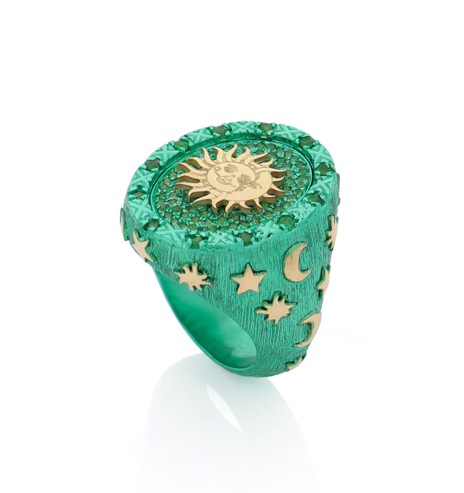 - Design unico : con il suo tema celeste e l'uso audace di pietre preziose verdi, questo anello si distingue come un vero e proprio pezzo forte per chiunque voglia indossare il proprio amore per il cosmo.