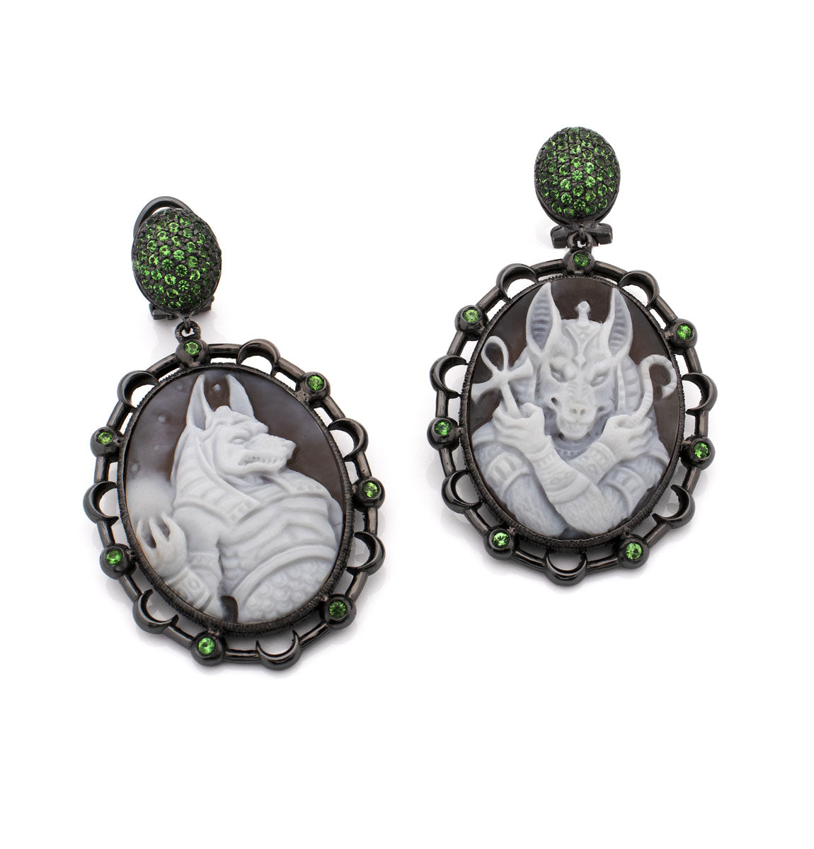 Ogni cammeo è incorniciato da una montatura in metallo scuro, impreziosita da brillanti pietre preziose verdi che ne esaltano l'audacia. Il ricco contrasto tra i toni intensi del metallo e le scintillanti pietre verdi crea un effetto lussuoso, rendendo questi orecchini un vero e proprio pezzo forte, perfetto per le occasioni speciali o per un sofisticato look quotidiano.