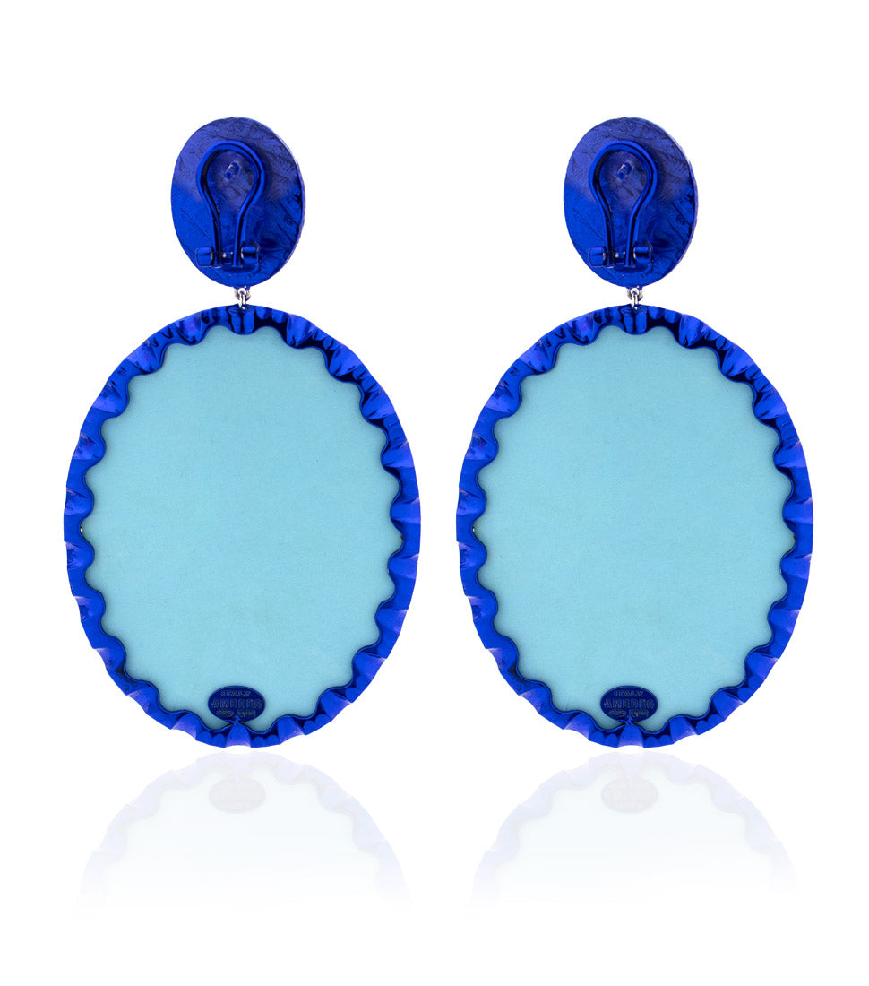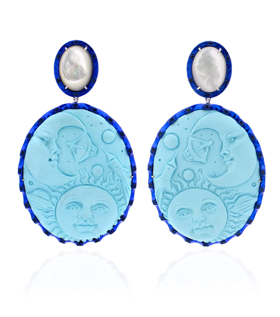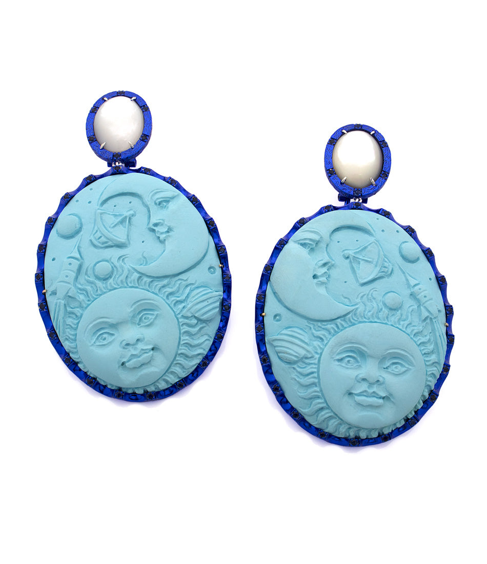 I cammei, intagliati in una tonalità di azzurro chiaro, sono incorniciati da un vivace bordo blu reale che aggiunge profondità e intensità al design complessivo. Sopra ogni cammeo, una perla bianca aggiunge un tocco di eleganza, riflettendo il tenue bagliore della luna. La combinazione di blu e bianco esalta il tema celeste degli orecchini, rendendoli moderni e al tempo stesso intramontabili.