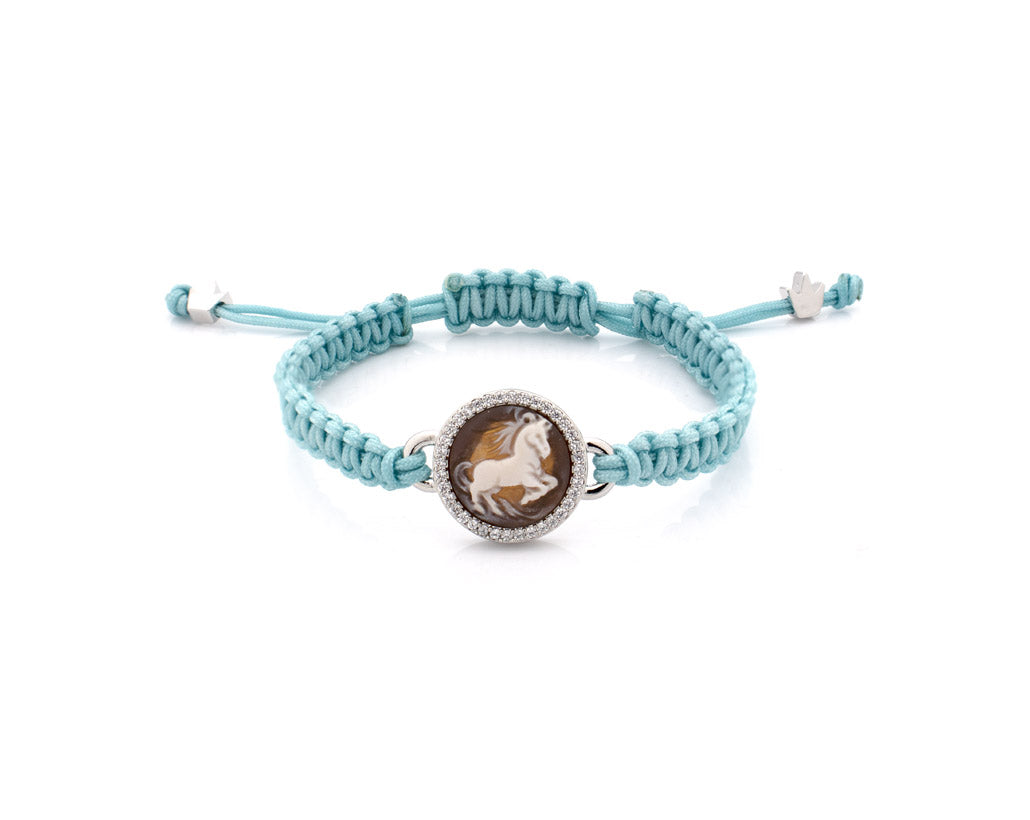 Blue Horse cattura la forza e lo spirito di un pony selvaggio in un cammeo intagliato a mano, incastonato su un morbido bracciale intrecciato blu. Simbolo di libertà e grazia, questo grazioso gioiello è perfetto per i piccoli avventurieri che sognano di galoppare in mondi magici.