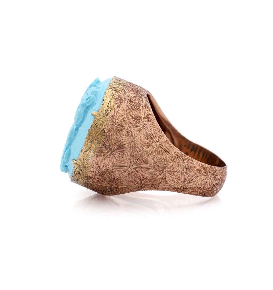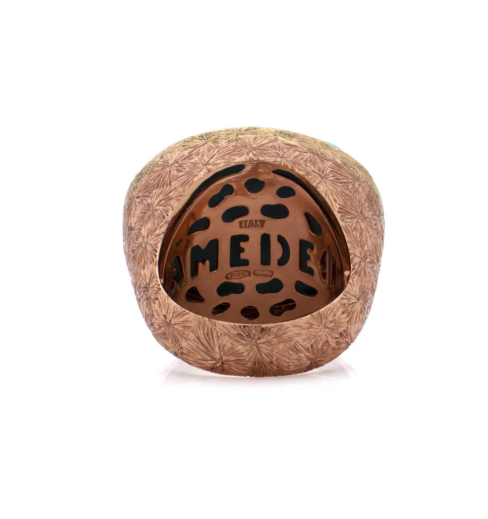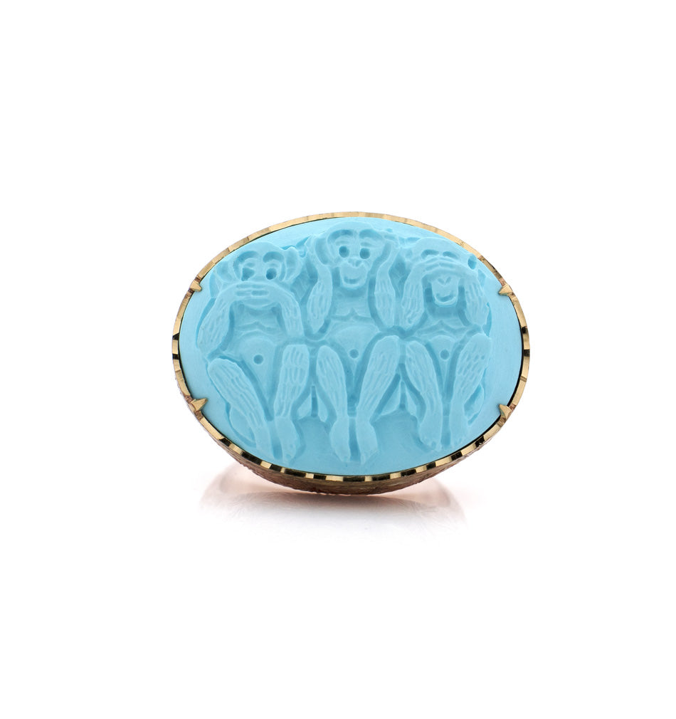 Vi presentiamo un anello che unisce un simbolismo giocoso a un'artigianalità senza tempo: l'anello con cammeo turchese "Le Tre Scimmie Sagge". Ispirato all'antico proverbio "Non vedere il male, non sentire il male, non parlare del male", questo gioiello è meticolosamente intagliato a mano nella pietra turchese, raffigurando le iconiche tre scimmie in una rappresentazione classica. Il blu vibrante del cammeo contrasta elegantemente con gli intricati dettagli dorati che incorniciano l'opera.