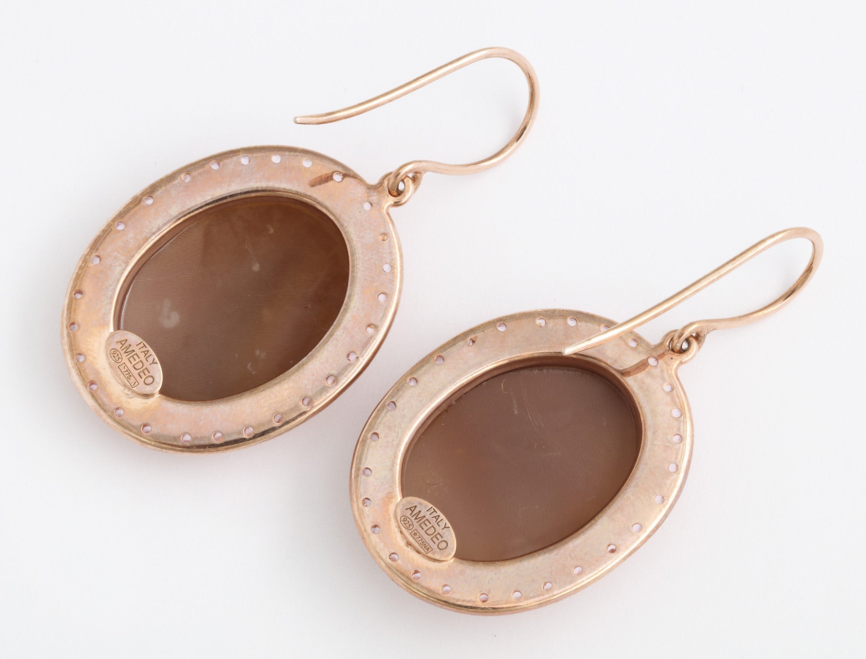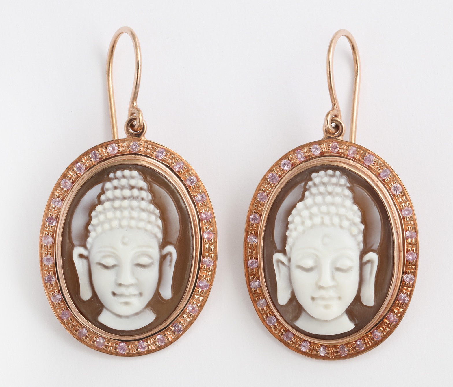 I cammei di Buddha sono incorniciati da una delicata montatura in oro rosa, ulteriormente impreziosita da un cerchio di scintillanti pietre preziose rosa che aggiungono un tocco morbido e lussuoso al design. L'equilibrio tra i toni freddi del cammeo bianco e il caldo abbraccio dell'oro rosa crea un contrasto armonioso, rendendo questi orecchini un accessorio senza tempo per ogni occasione.