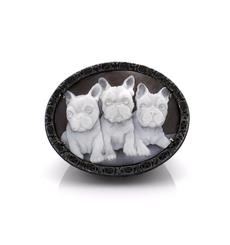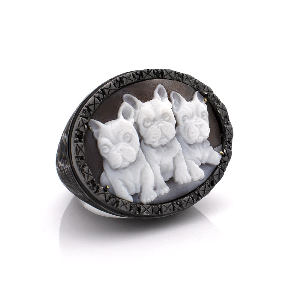 Vi presentiamo la massima espressione di artigianalità e creatività: un anello unico che cattura l'essenza della lealtà e del fascino canino. Questo straordinario pezzo presenta un cammeo meticolosamente intagliato a mano raffigurante tre bulldog francesi, ognuno inciso con precisione realistica in un classico contrasto marrone e bianco. Incastonato in un'intricata cornice nera, l'intaglio dettagliato è incastonato su una fascia in metallo nero audace e testurizzata, che ne esalta l'estetica moderna e audace.