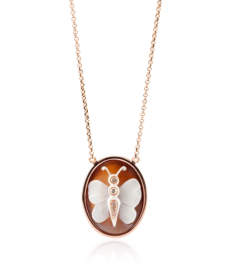 Questo squisito pendente a farfalla è un capolavoro di eleganza artigianale, che unisce l'arte senza tempo dell'intaglio del cammeo al lusso del design moderno della gioielleria. La delicata farfalla è finemente scolpita nella conchiglia di sardonica, a testimonianza della maestria artigianale e dell'attenzione ai dettagli. Il pendente è incorniciato da una calda montatura in oro rosa, che esalta la bellezza naturale del cammeo e aggiunge un tocco sofisticato.