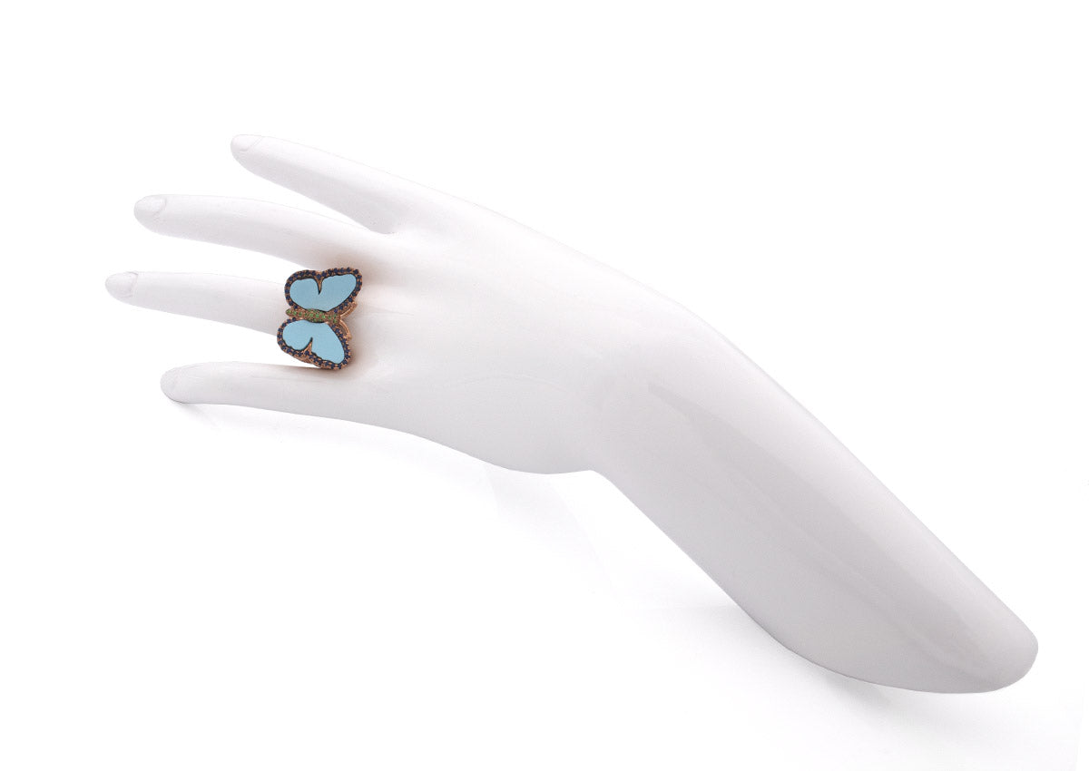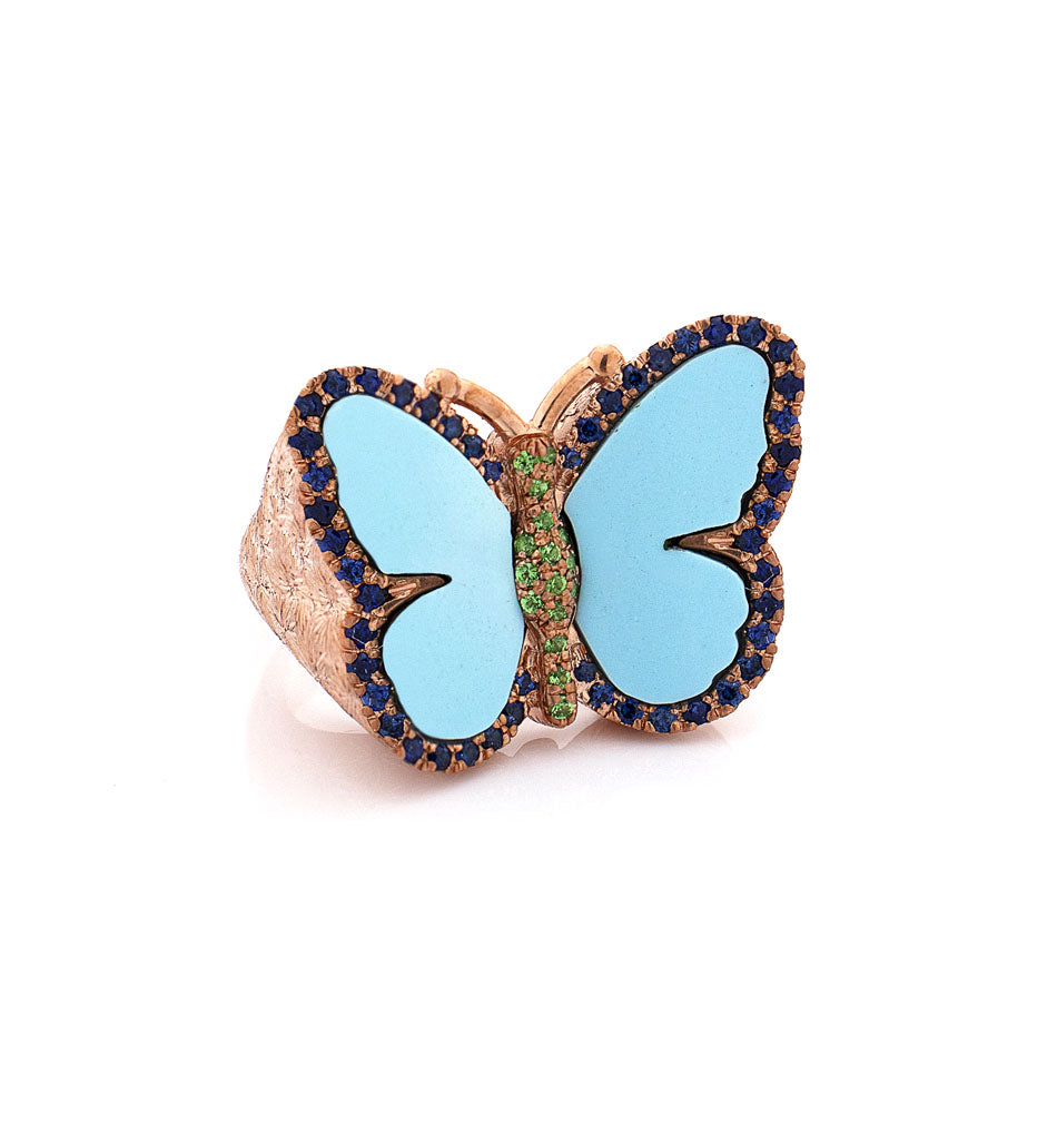 Ispirato alla bellezza più rara della natura, Wings of Eden è un anello a forma di farfalla unico nel suo genere, che cattura la delicata danza di colori e luci. Caratterizzato da vivaci ali turchesi impreziosite da scintillanti zaffiri blu e lussureggianti tsavoriti verdi, questo gioiello in argento sterling realizzato a mano celebra la trasformazione, la libertà e l'eleganza.