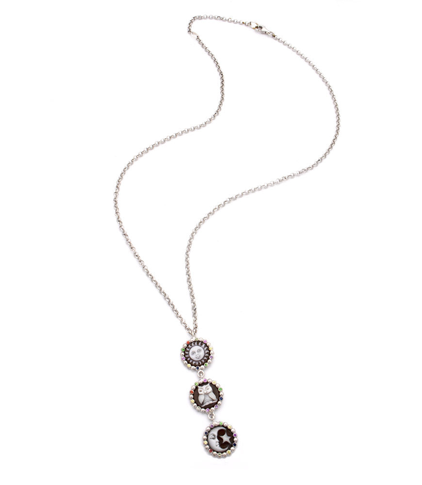 Questa collana realizzata a mano è caratterizzata da tre simbolici ciondoli a forma di cammeo, ognuno circondato da un luminoso alone di pietre preziose arcobaleno.