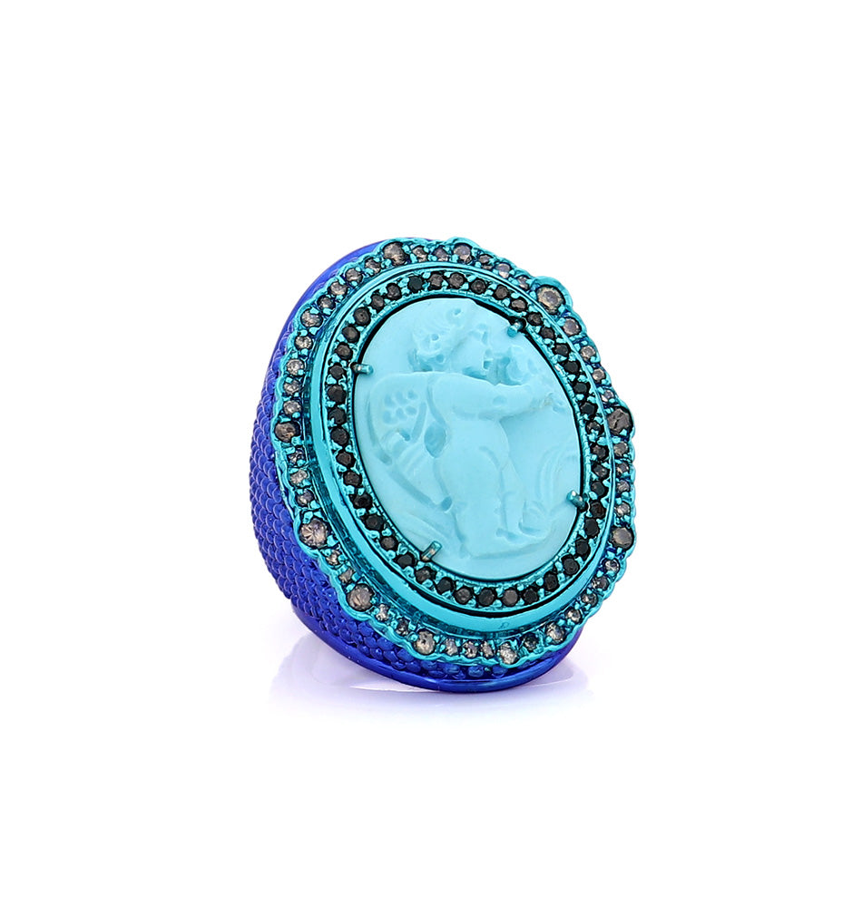 - Design unico : questo anello si distingue per il suo audace cammeo turchese a forma di cherubino e i ricchi dettagli in pietre preziose, rendendolo un must per chi ama i gioielli vistosi.