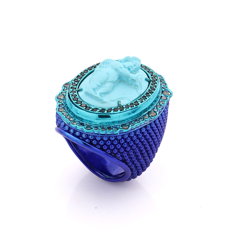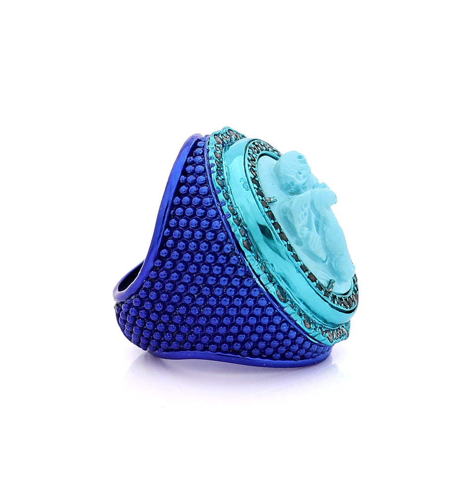 Vi presentiamo l' anello Cherub Cameo , un'abbagliante combinazione di eleganza storica e lusso moderno. Questo anello presenta un cammeo a forma di cherubino in turchese splendidamente scolpito, incastonato su uno sfondo di brillanti pietre preziose blu e nere, offrendo un tocco audace e unico per ogni amante dei gioielli. Il vivido contrasto di colore e la meticolosa lavorazione artigianale rendono questo anello un pezzo indimenticabile in qualsiasi collezione.