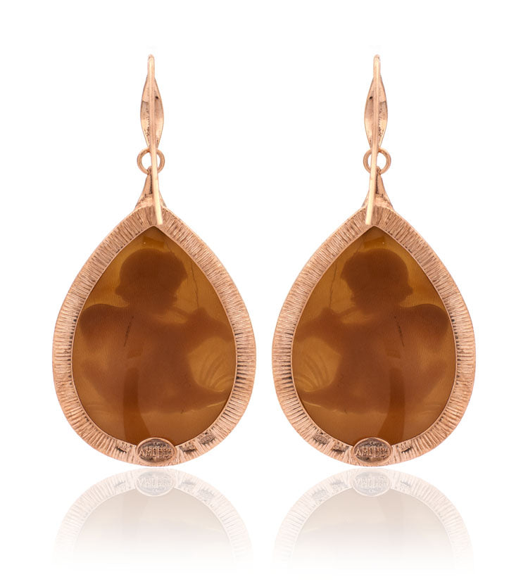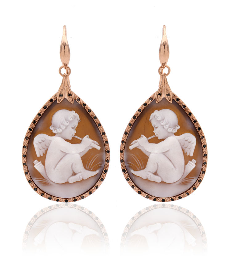 Vi presentiamo un paio di orecchini unici che catturano l'essenza del romanticismo e dell'eleganza. Questi cammei a forma di goccia, sapientemente intagliati con angelici cherubini che suonano delicati flauti, rappresentano un'arte senza tempo. Incastonati in una calda montatura in oro rosa con dettagli intricati, gli orecchini evocano un fascino vintage che sa essere al tempo stesso classico e moderno.