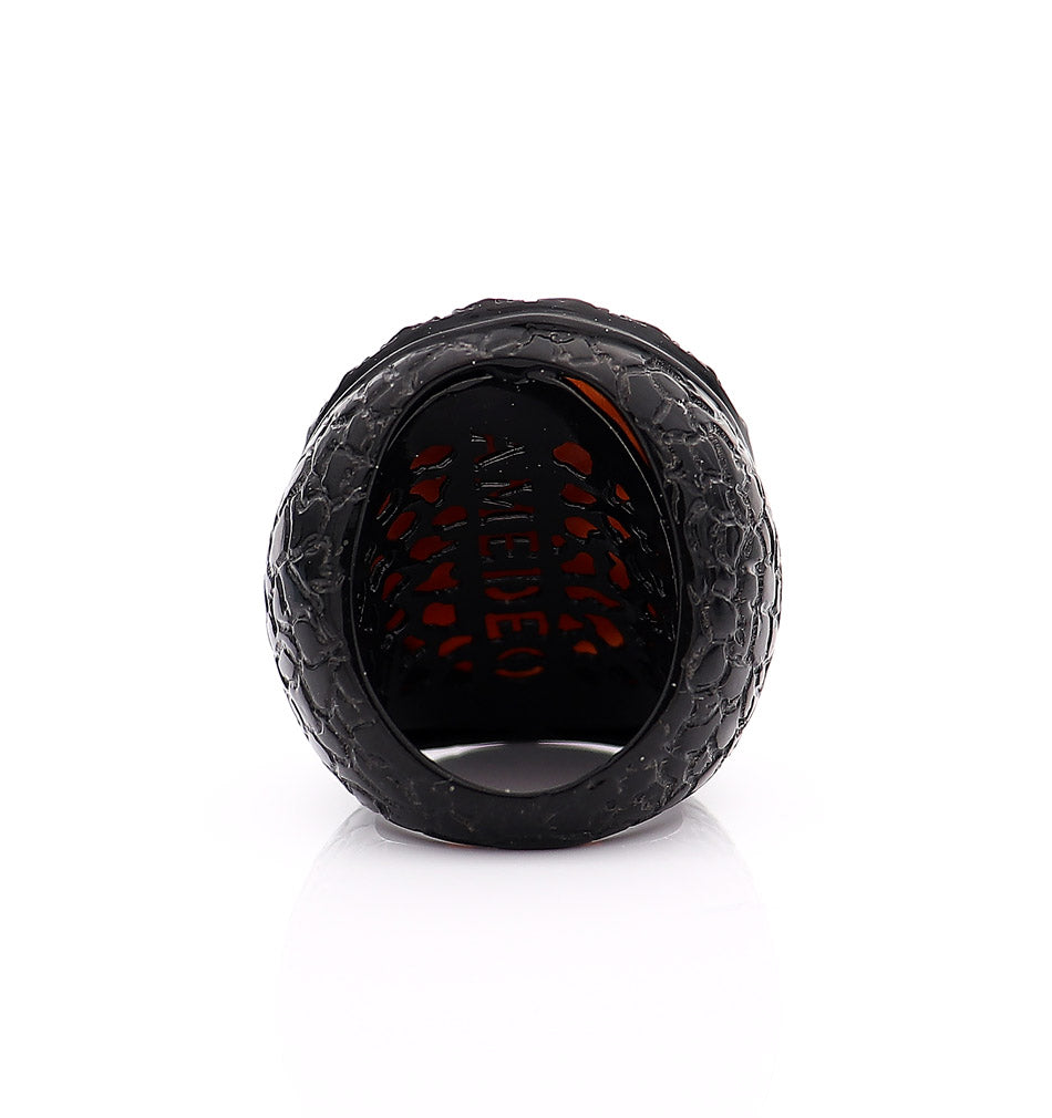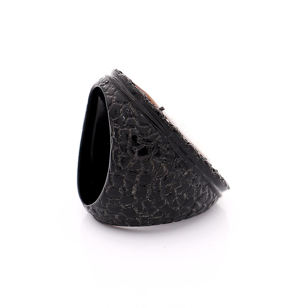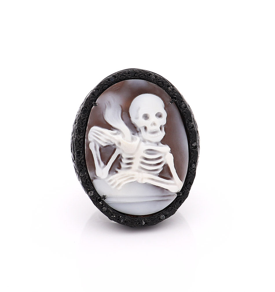 Un capolavoro audace e audace, questo anello unico presenta un cammeo scheletrato intagliato a mano, finemente decorato in bianco su sfondo scuro, che gli conferisce un contrasto sorprendente che cattura l'attenzione. La fascia nera testurizzata, realizzata con meticolosa cura dei dettagli, completa il design inquietante ma accattivante del cammeo. Questo pezzo incarna il perfetto equilibrio tra estetica gotica e lusso, offrendo un tocco d'avanguardia alla gioielleria tradizionale.