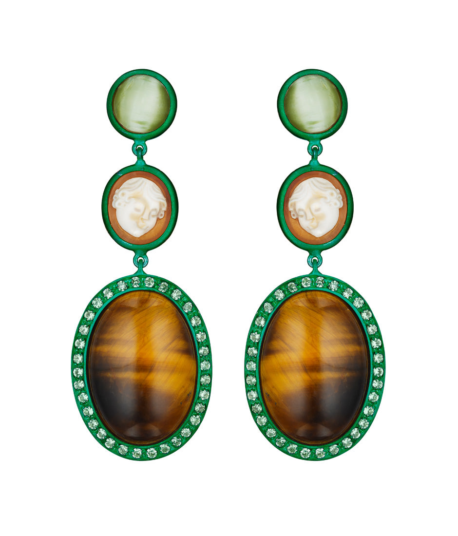 Orecchini pendenti con occhio di tigre e cammeo: una fusione audace di eleganza classica e glamour contemporaneo