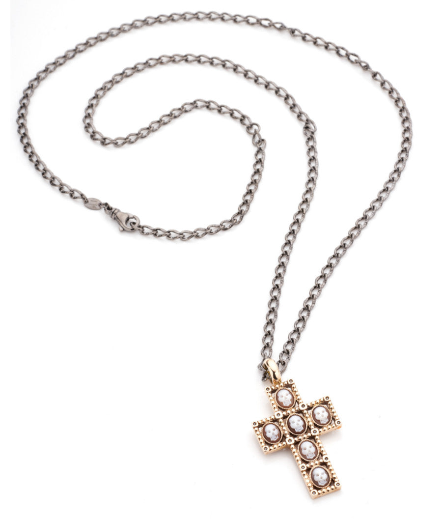 Vi presentiamo l'esclusivo pendente a croce con teschio Amedeo Cameo , una squisita combinazione di artigianato storico e modernità. Questo pendente reinterpreta il classico motivo a croce integrando sei cammei a forma di teschio finemente intagliati a mano. Ogni teschio, simbolo spesso associato alla natura fugace della vita, crea un netto contrasto con le ricche e calde tonalità della montatura placcata oro. I delicati dettagli dei cammei mettono in risalto la consolidata tradizione dell'artigianato italiano, in particolare di Torre del Greco, nota per la sua magistrale lavorazione dei cammei.