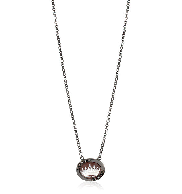Vi presentiamo la collana Cameo Crown, un gioiello splendido ed elegante che incarna lusso e raffinatezza. Questa collana presenta un cammeo a forma di corona, meticolosamente intagliato a mano, incastonato in un'elegante montatura in metallo annerito. La corona, simbolo di regalità e grandezza, risalta sui toni caldi e intensi dello sfondo marrone, creando un contrasto sorprendente.