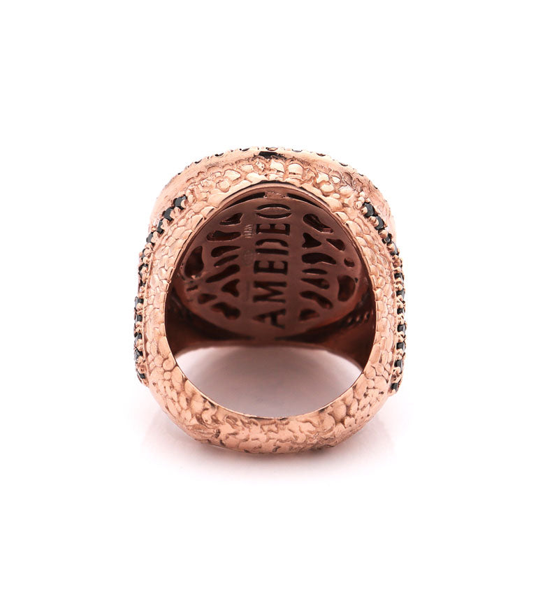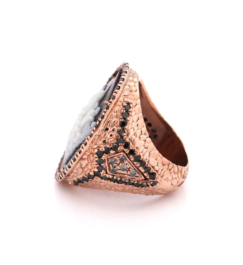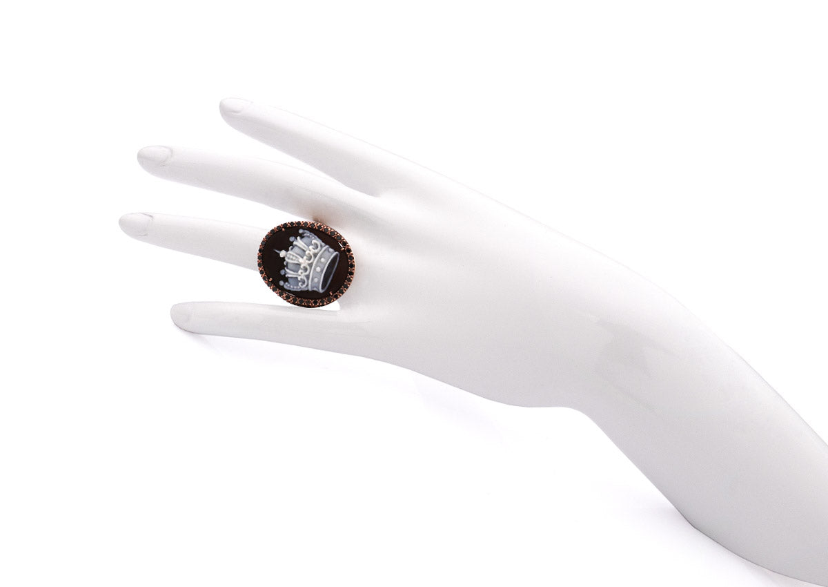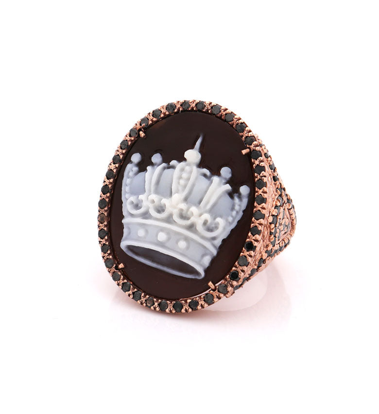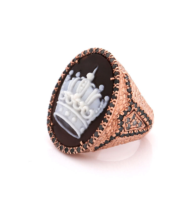 Esalta il tuo stile con l'anello "Crown Majesty", un capolavoro che incarna la raffinatezza regale. Realizzato in argento sterling, questo anello di grande impatto presenta un maestoso design a corona, splendidamente impreziosito da diamanti neri e grigi. I dettagli intricati e il cammeo di ispirazione antica aggiungono un fascino senza tempo, rendendolo l'accessorio perfetto per chi cerca eleganza e individualità.