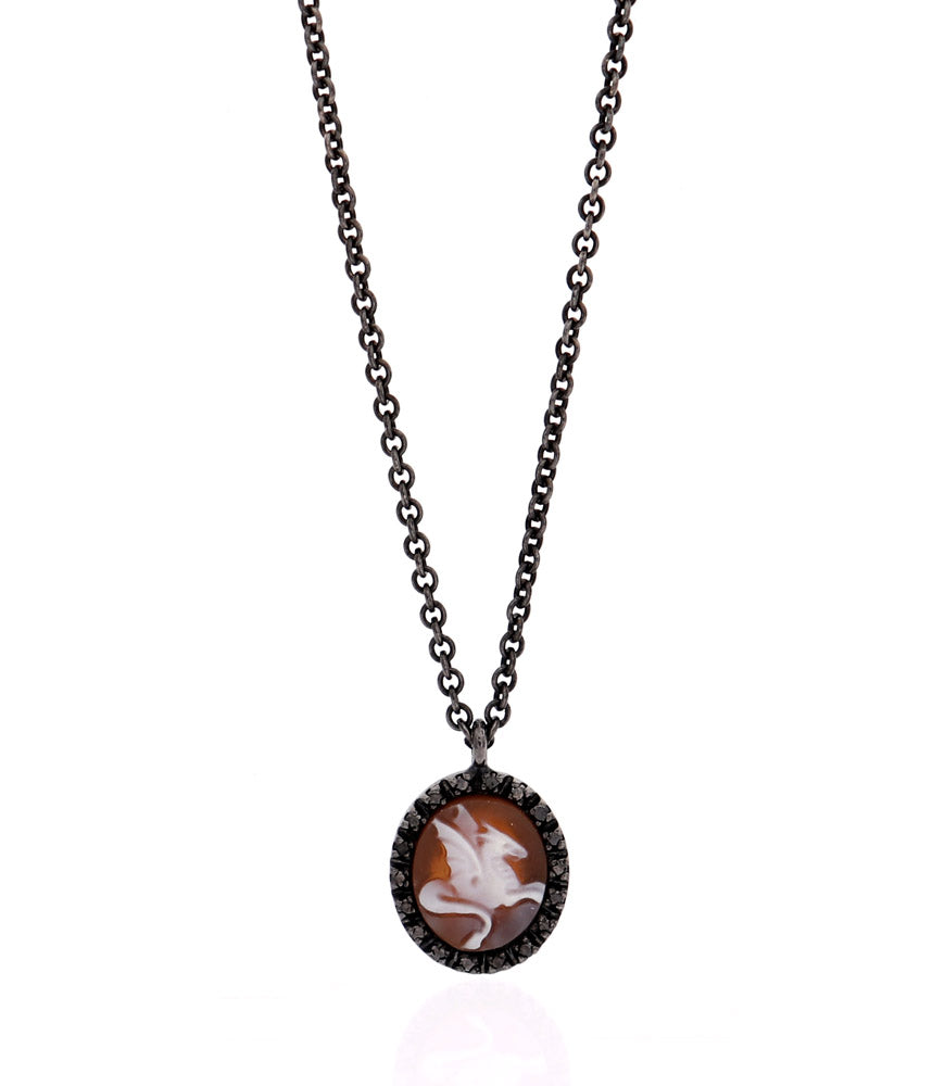 Questa esclusiva collana dai toni scuri mette in mostra la potenza e l'eleganza di un cammeo di drago intagliato a mano. Incastonato in una catena annerita di ispirazione vintage e incorniciato da un anello di pietre preziose scure, il pezzo forte di questa collana è il drago finemente intagliato, raffigurato in bianco su uno sfondo marrone intenso. Il contrasto di colori e texture aggiunge profondità alla figura mitologica, incarnando grazia e forza.