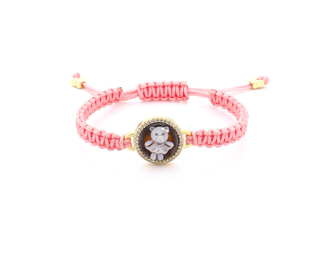Un tenero e protettivo orsacchiotto, delicatamente intagliato a mano in un cammeo, avvolge con amore il polso di ogni bambina. Il bracciale Dream Teddy presenta un cordino intrecciato rosa e dettagli dorati, pensato per accompagnare i sogni e le avventure quotidiane.