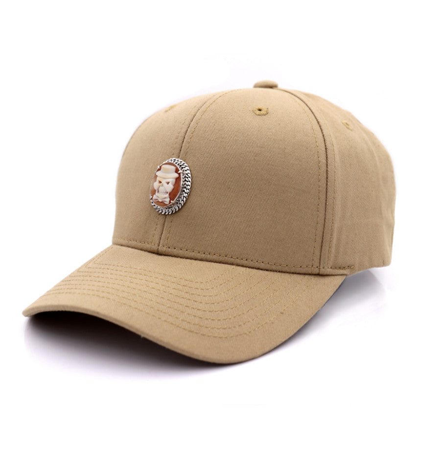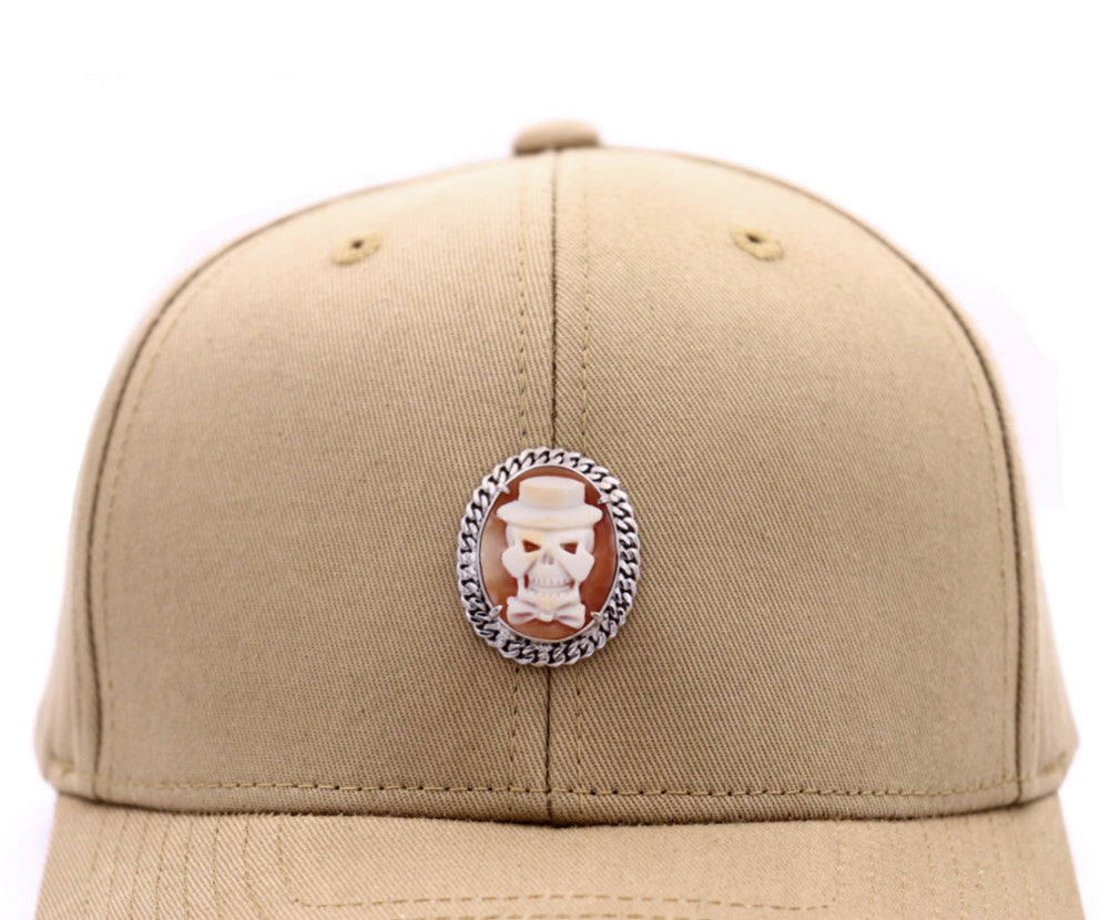 Questo berretto unico porta il copricapo a un livello completamente nuovo di arte e personalità. Al centro di questo berretto beige, una spilla con cammeo intagliata a mano raffigurante un misterioso ed elegante scheletro con un cilindro è incastonata in una dettagliata cornice d'argento. Il motivo dello scheletro non è solo un'audace dichiarazione di stile, ma simboleggia anche l'abbraccio della vita e della mortalità, fondendo un'estetica classica e moderna.