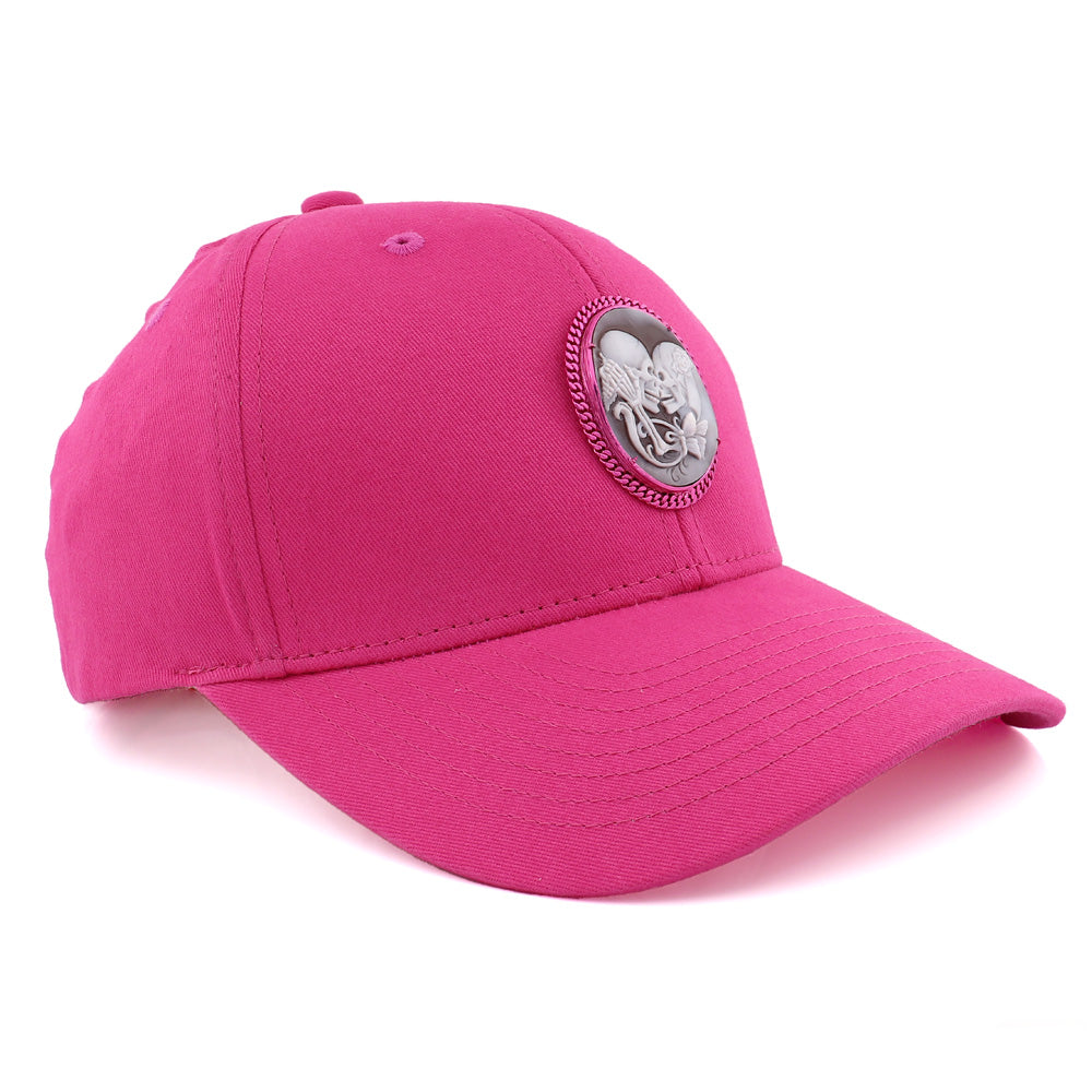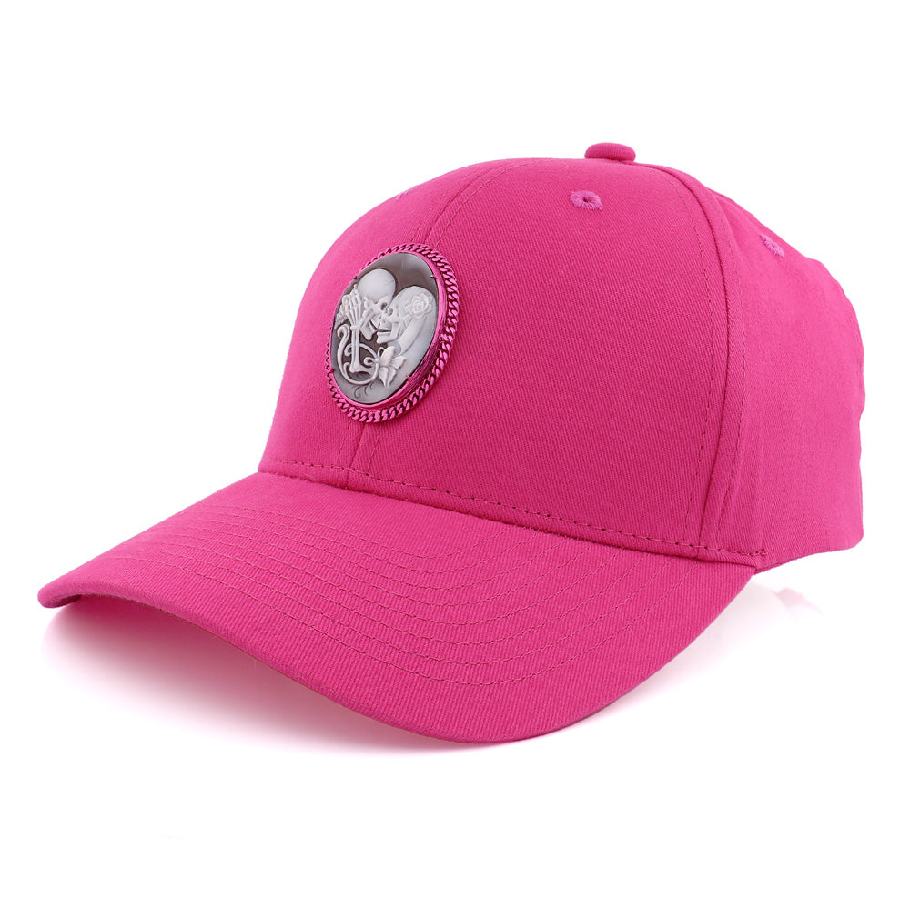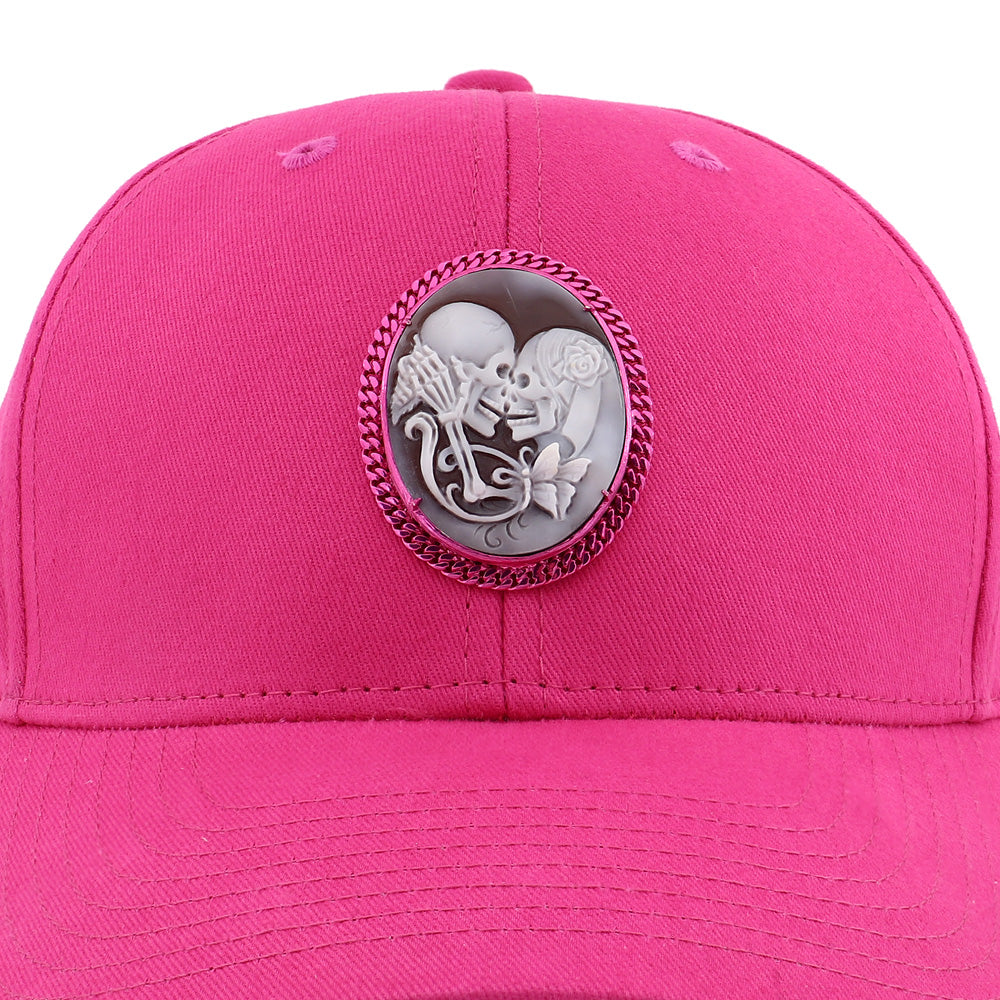 Un mix audace e unico di artigianalità classica e moda moderna: questo cappellino da baseball rosa acceso presenta una splendida spilla con cammeo al centro. Il cammeo, delicatamente scolpito, raffigura una romantica coppia di scheletri, eternamente intrecciati, circondati da intricati dettagli floreali. Incastonata in una lucida cornice rosa, la spilla conferisce un tocco elegante e artistico a un accessorio quotidiano.