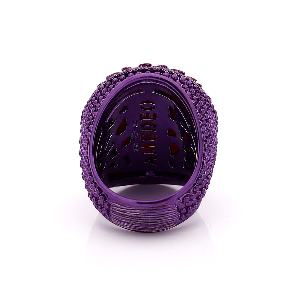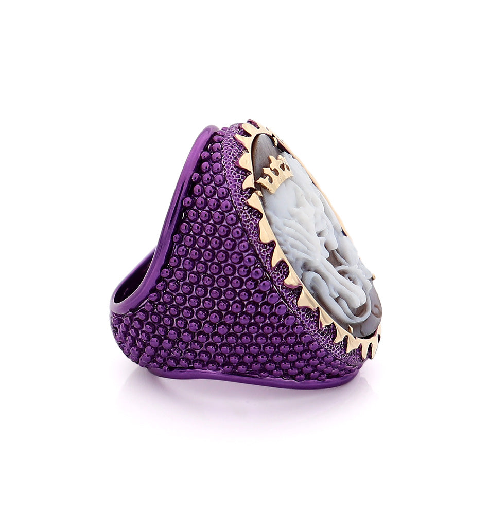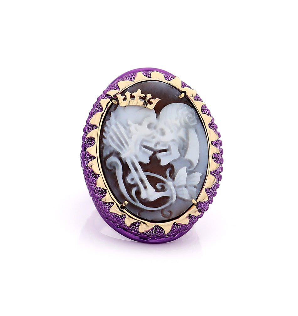 Questo straordinario anello presenta un design audace e accattivante che unisce eleganza e originalità. L'intricato cammeo centrale raffigura due scheletri in un eterno abbraccio, incoronati da un simbolo reale, che crea un sorprendente contrasto con i dettagli regali. Il ricco colore viola della fascia dell'anello, impreziosita da incisioni dettagliate, ne esalta il fascino drammatico, mentre la cornice dorata attorno al cammeo aggiunge un tocco di lusso. Questo gioiello rappresenta una potente dichiarazione d'amore oltre la vita e la morte, rendendolo non solo un accessorio unico, ma anche un punto di partenza per una conversazione. Ideale per chi abbraccia la bellezza dei gioielli non convenzionali e desidera esprimere la propria individualità attraverso la moda.