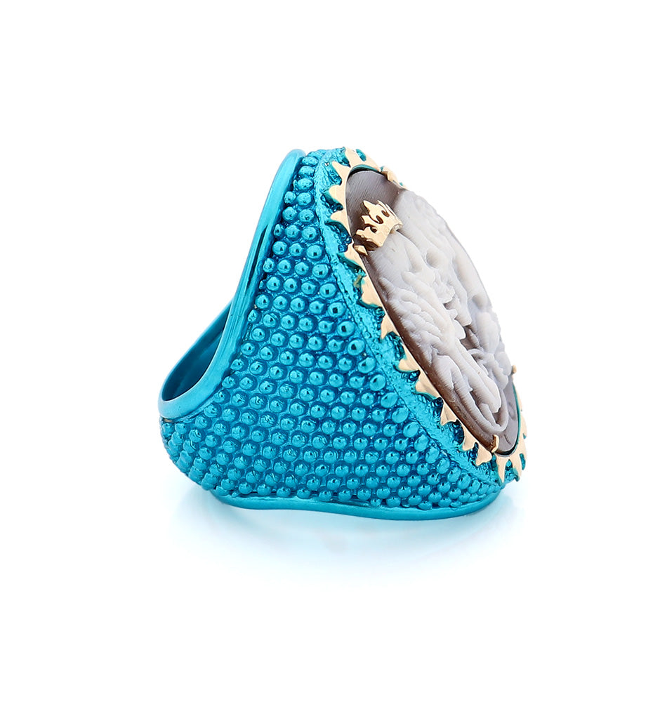 La corona d'oro in cima al cammeo e la montatura frastagliata e spigolosa conferiscono un tocco regale, simboleggiando un legame regale con un amore senza tempo. Realizzato con precisione, questo anello sfoggia non solo una maestria artigianale, ma anche una personalità audace, rendendolo l'accessorio perfetto per chi desidera unire la storia alla moda contemporanea.
