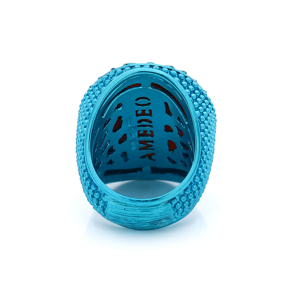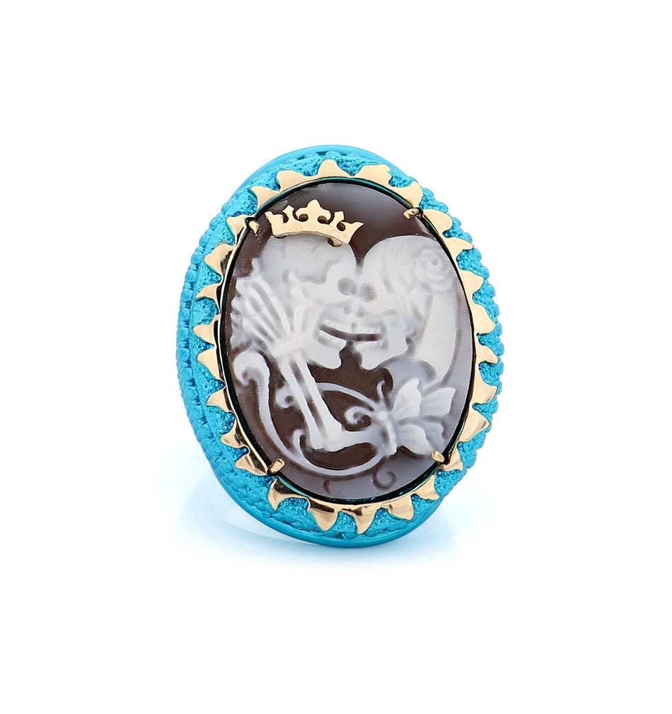 Vi presentiamo un pezzo audace che fonde l'arte tradizionale con il design contemporaneo: "ENDLESS LOVE". Il pezzo forte di questo straordinario anello è un cammeo meticolosamente intagliato a mano che raffigura una coppia di scheletri in un abbraccio eterno, incoronati da un simbolo di amore eterno. I delicati dettagli delle figure contrastano magnificamente con la vibrante montatura turchese testurizzata che avvolge l'anello, aggiungendo un tocco di colore e un tocco moderno a questa forma d'arte classica.