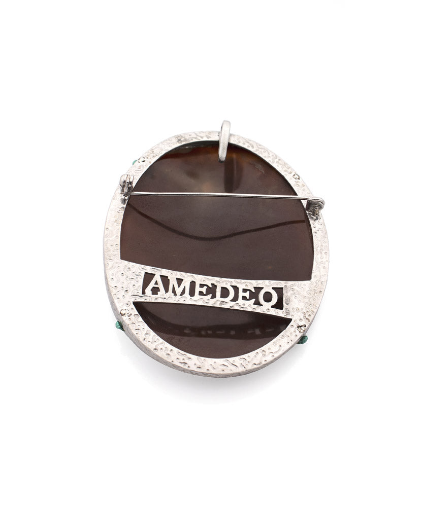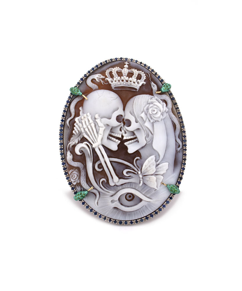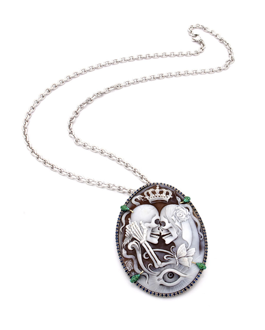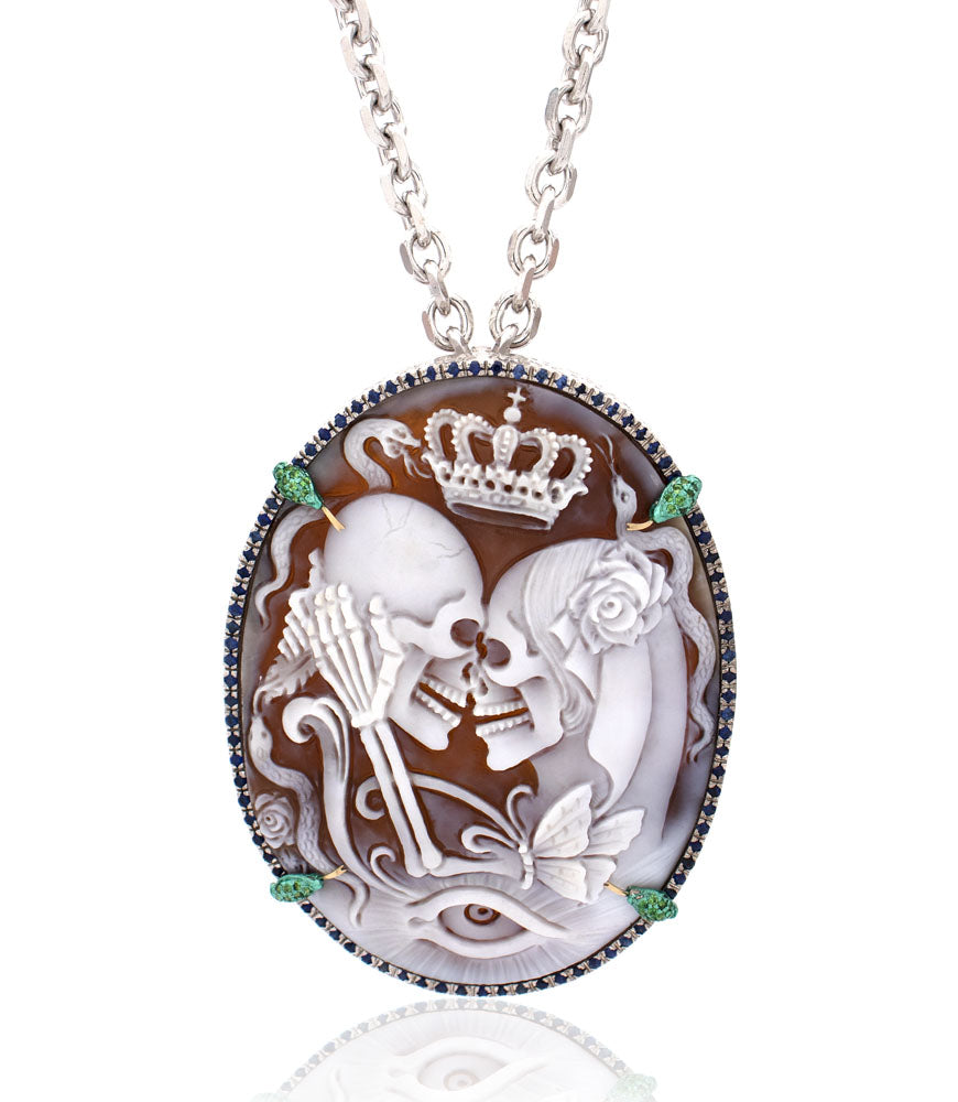 Ricavate dalle conchiglie più pregiate, incorniciate in argento e oro e impreziosite da zaffiri blu intenso e vivaci tsavoriti , questa straordinaria collana e spilla con cammeo racconta una storia d'amore senza tempo che va oltre la vita stessa.