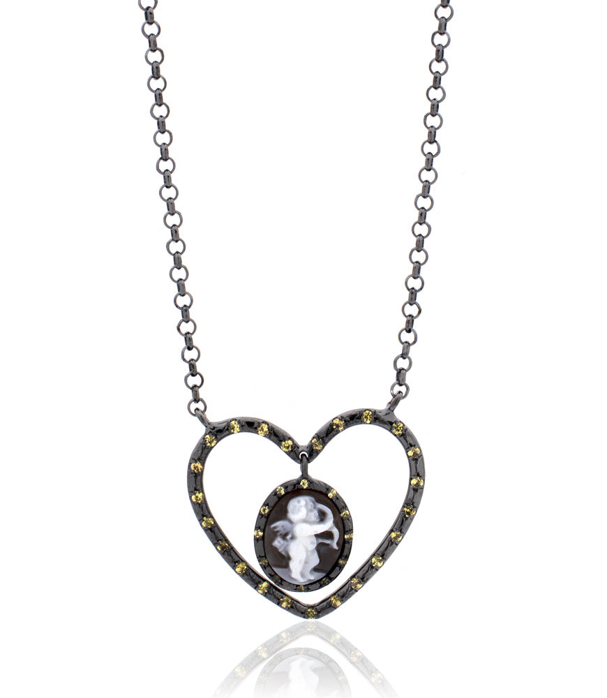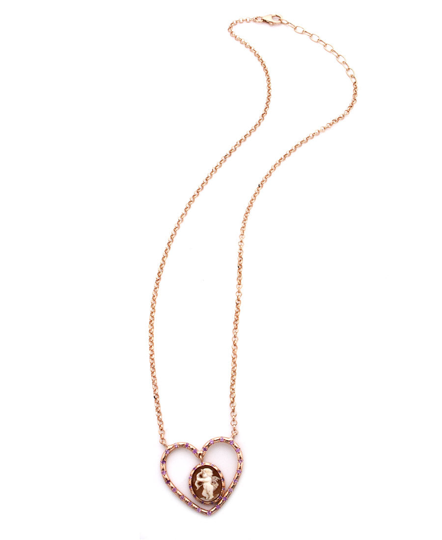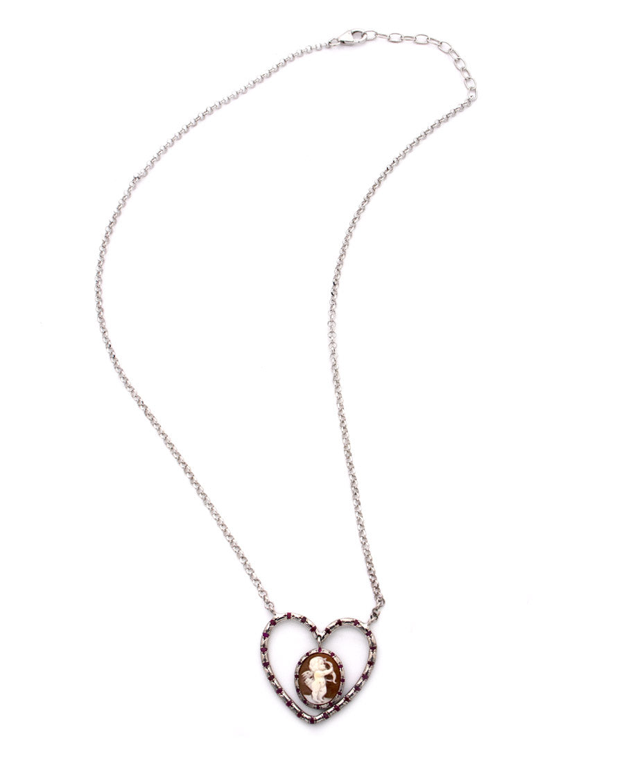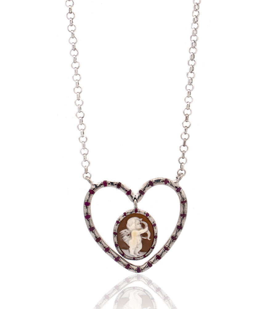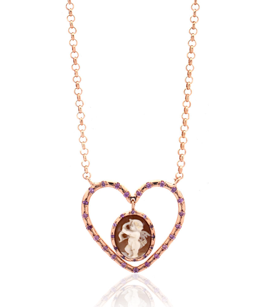 La nostra collezione Heart Cameo celebra l'amore, l'arte e la bellezza senza tempo. Al centro, un cammeo a forma di cherubino finemente lavorato, simbolo di innocenza e devozione, incorniciato da un pendente a forma di cuore impreziosito da pietre preziose incastonate a mano come zaffiri, rubini e ametiste.