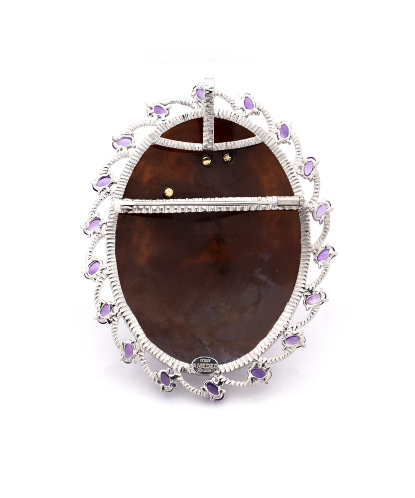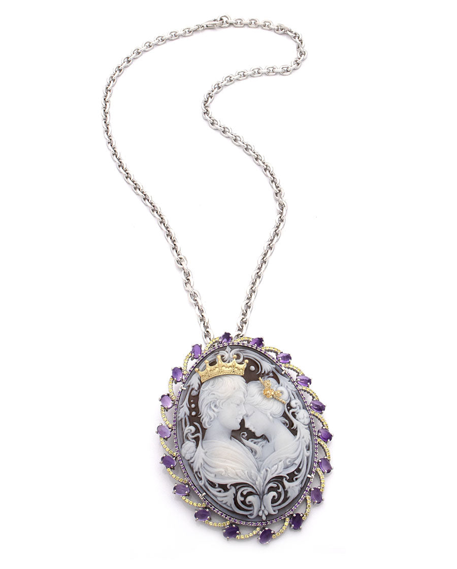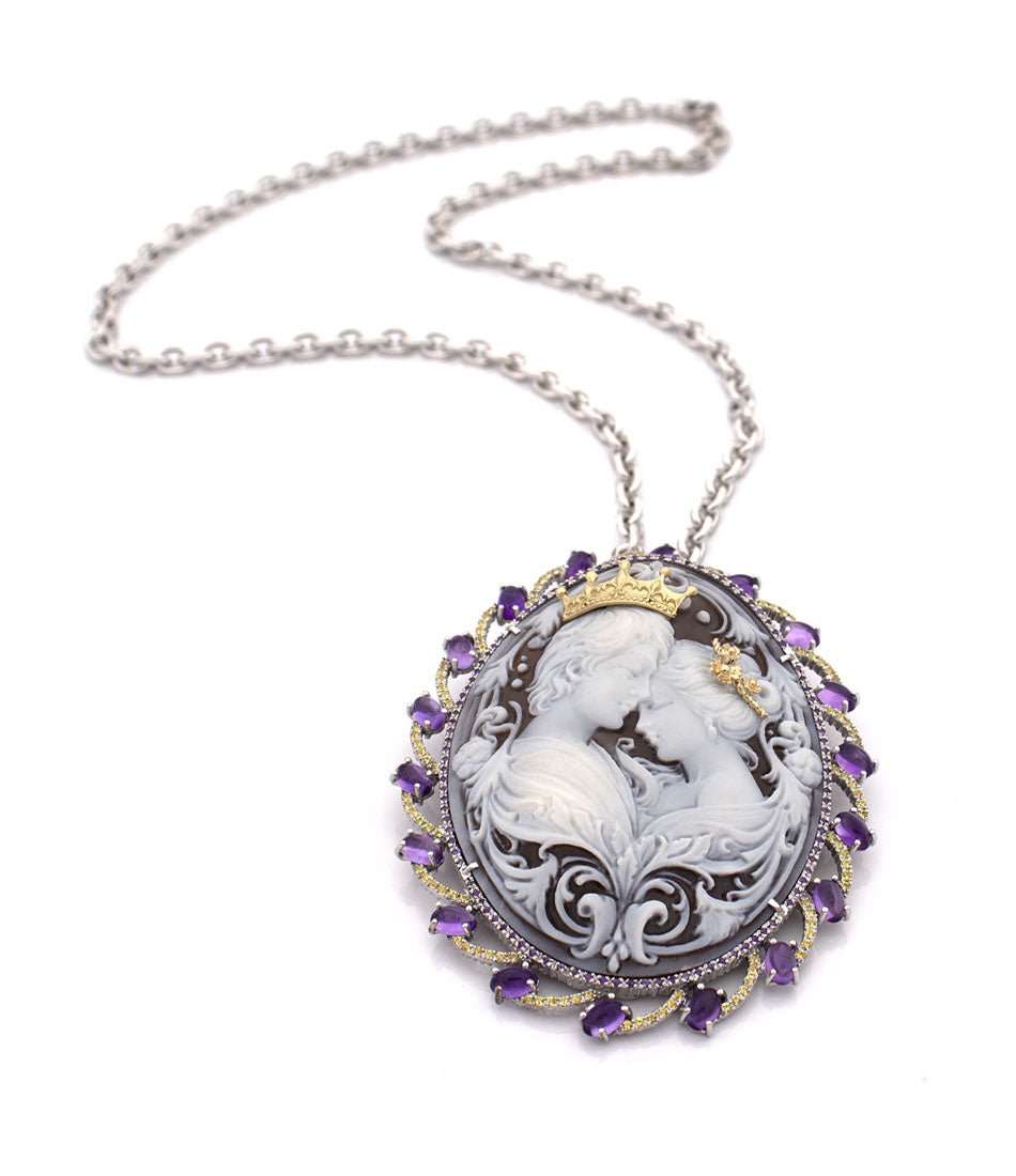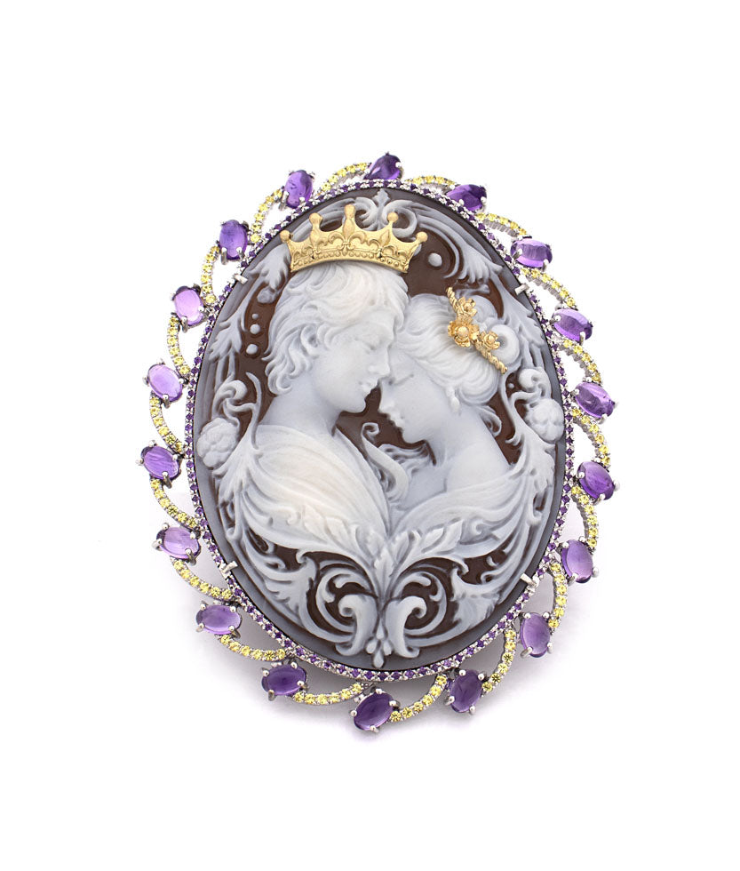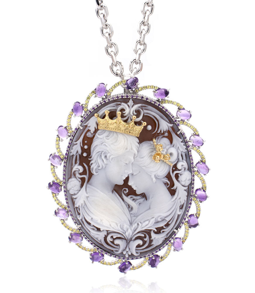 Questo cammeo non è solo un ornamento, ma un simbolo di promesse eterne. Può essere indossato come spilla, adagiato con grazia su un abito elegante, o trasformato in una collana regale, abbracciando il décolleté con la sua raffinata bellezza. Ogni dettaglio inciso, ogni pietra preziosa incastonata, racconta di un'arte antica, di mani sapienti che hanno dato vita all'amore attraverso la maestria artigianale.