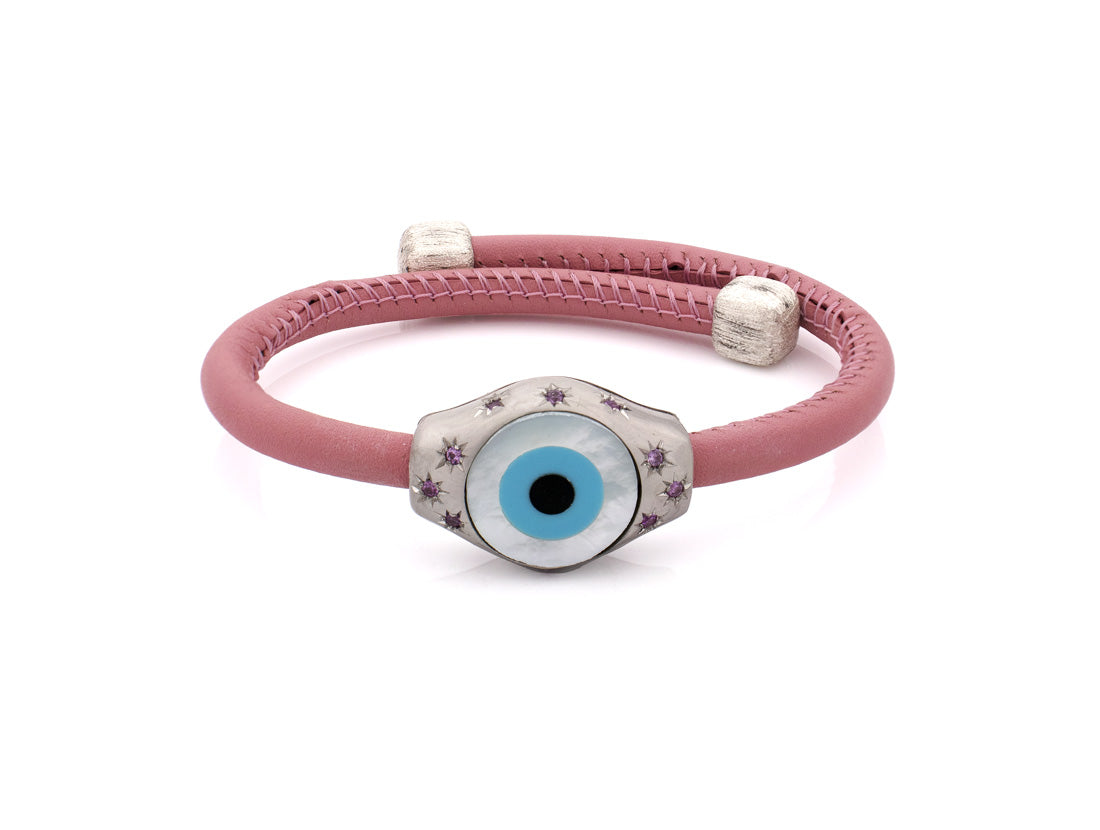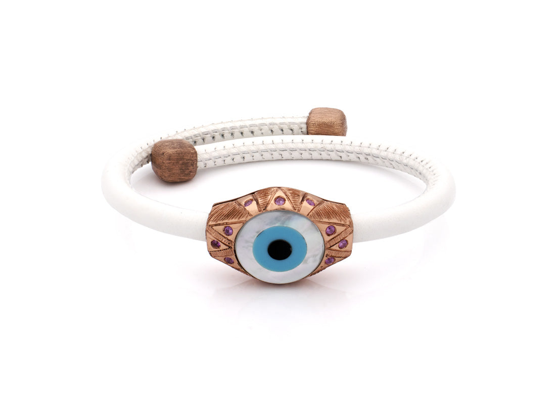 Abbraccia un delicato mix di eleganza e tradizione con questo raffinato bracciale Evil Eye, disponibile in oro rosa e con dettagli pastello. Realizzato con una fascia in pregiata pelle bianca o rosa, presenta un accattivante ciondolo centrale con l'Evil Eye, progettato per offrire protezione e allontanare le energie negative. I dettagli in oro rosa e lavanda aggiungono un tocco di calore e femminilità, rendendo questo gioiello non solo un simbolo di protezione spirituale, ma anche un'elegante dichiarazione di stile.