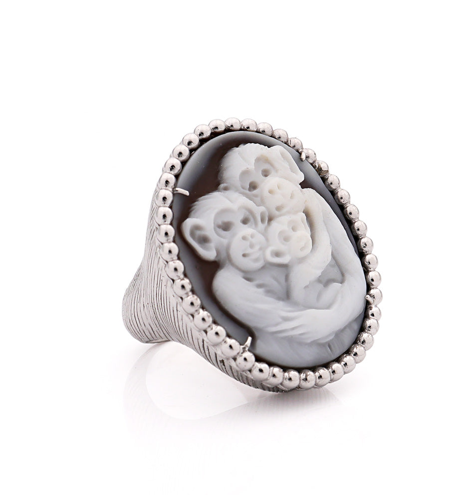Questo splendido anello presenta un cammeo splendidamente scolpito raffigurante una famiglia di scimmie, che si abbracciano con tenero affetto. La lavorazione artigianale cattura una scena di amore e protezione, simboleggiando la forza dei legami familiari. Il cammeo, incastonato in una montatura in argento lucido con un delicato bordo perlato, crea una cornice raffinata ed elegante che mette in risalto l'intricata lavorazione.