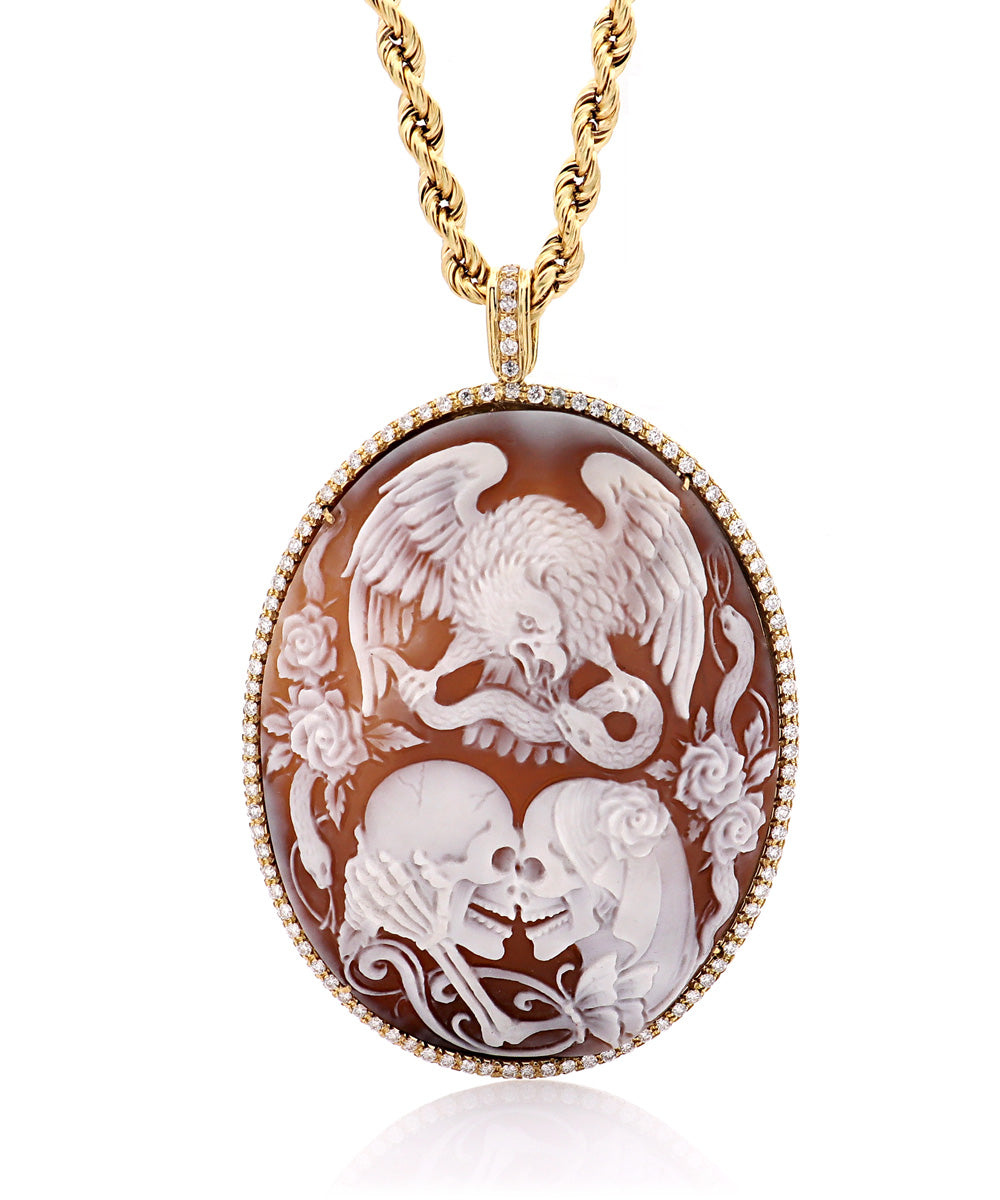 Il contrasto tra l'abbraccio etereo degli amanti scheletrici e il feroce simbolismo dell'aquila crea una narrazione avvincente che parla della dualità dell'esistenza: potere e vulnerabilità, vita e morte, amore e forza. Questo pendente, incastonato in un lussuoso oro e incorniciato da delicati diamanti, non è solo un gioiello, ma un'opera d'arte da indossare che invita a una profonda riflessione.