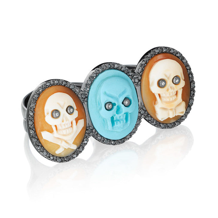 L'anello Skeledeo Double Finger Ring presenta tre distinti teschi intagliati a mano, incastonati su cammei di corniola e turchese da 20 mm, trasformando ogni teschio in un emblema unico di individualità e presenza. Realizzato in argento sterling con placcatura in rodio nero, il pezzo è impreziosito da diamanti bianchi e neri, che aggiungono una delicata brillantezza e profondità. Audace e intricato, questo anello si estende su due dita, creando un'affermazione imponente che fonde arte e carattere. Ogni teschio racconta la sua storia, invitando chi lo indossa ad abbracciare l'unicità, la sicurezza e l'audace interazione di colori, forme e simbolismo.