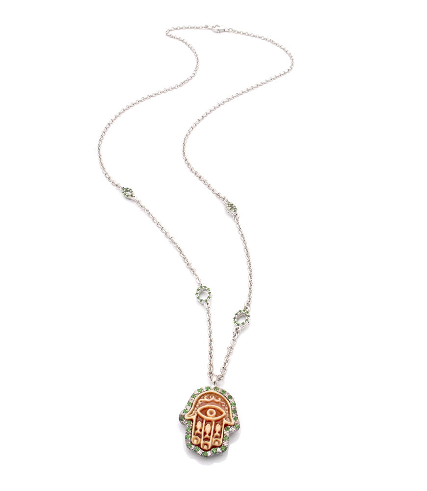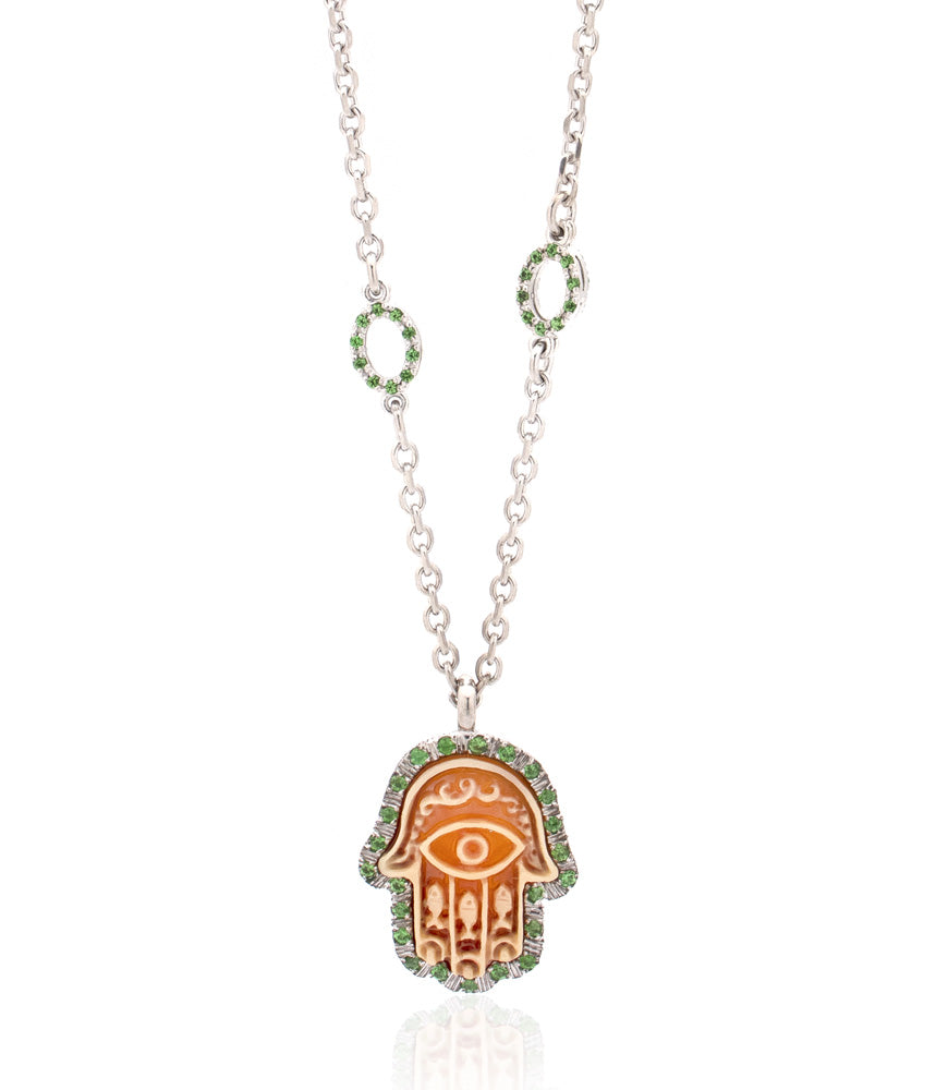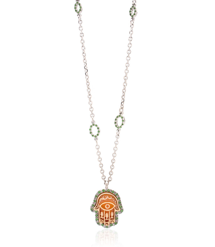 Il pendente Hamsa è realizzato in calde tonalità oro rosa ed è circondato da un alone di brillanti pietre preziose verdi, che aggiungono un tocco di lusso e un tocco di colore che ne esalta il fascino mistico. La raffinata catena in argento è impreziosita da anelli con pietre preziose verdi abbinate, creando un design armonioso e sofisticato.