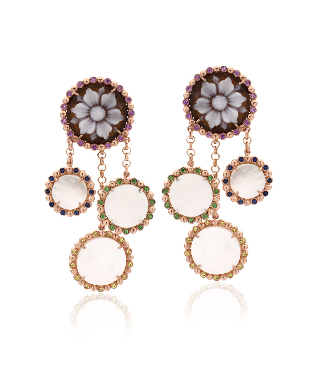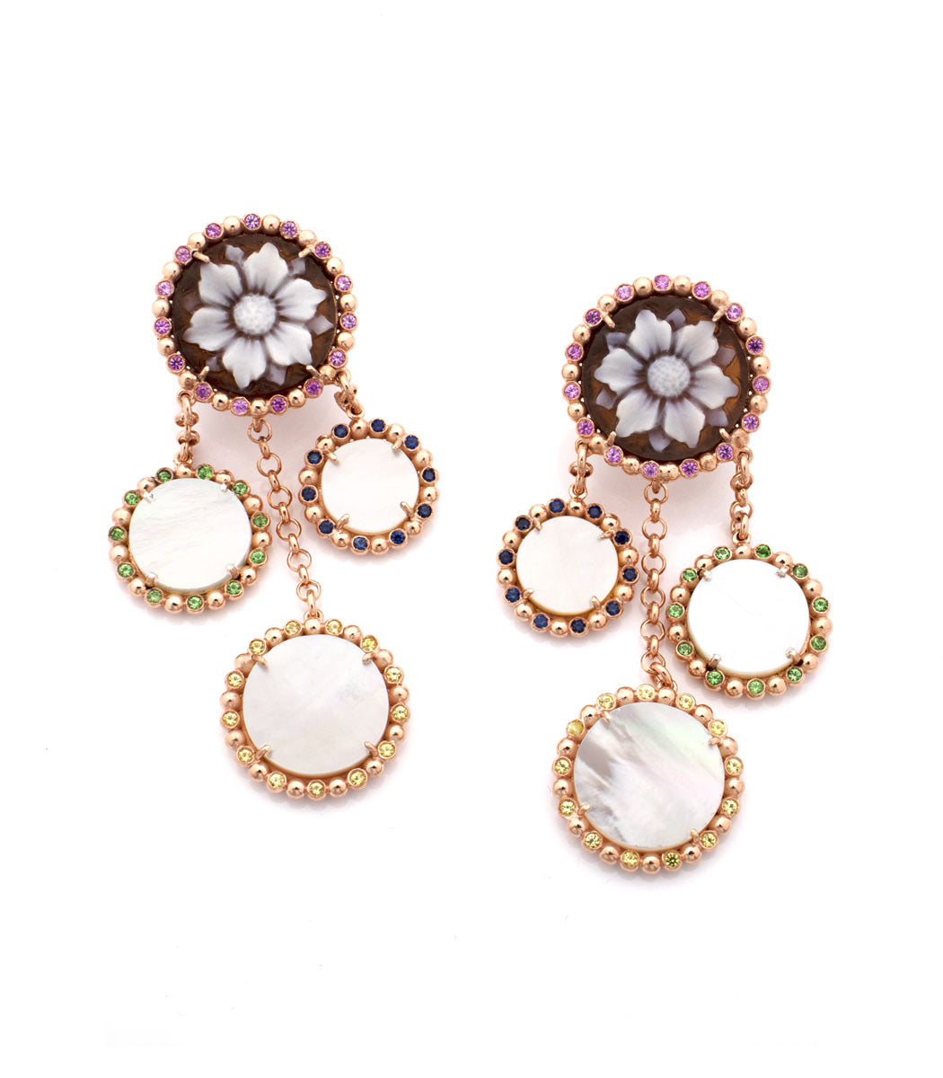 Ogni cammeo è scolpito a mano da conchiglia di sardonica , che cattura la morbida silhouette di un fiore in fiore congelato nel tempo. Intorno, una costellazione di zaffiri e tsavoriti brilla come rugiada mattutina sui petali, mentre madreperla aggiunge una delicata luminescenza, che richiama la luce della luna su un giardino in fiore.