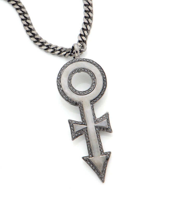 Realizzata con precisione, la collana con pendente Symbol è un esempio di attenzione ai dettagli che la eleva allo status di gioiello di alta gioielleria. La finitura in argento spazzolato conferisce al pendente un tocco contemporaneo, mentre gli accenti scuri, simili a diamanti, lungo i bordi aggiungono un tocco di lusso e raffinatezza. La robusta catena completa il pendente, creando un armonioso equilibrio tra audacia e raffinatezza.