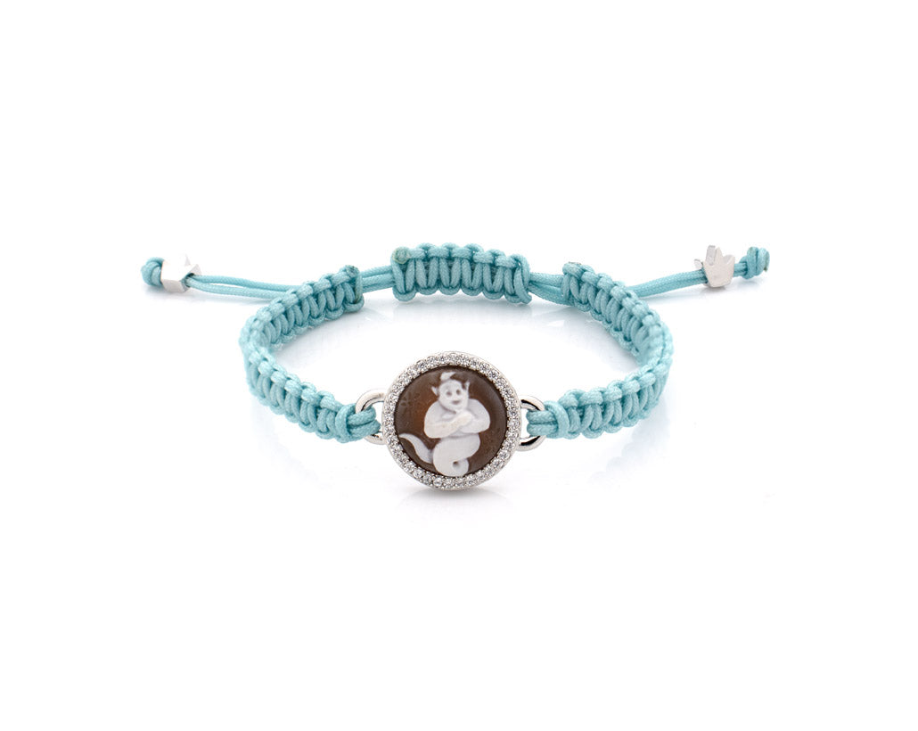 Un genio amichevole emerge da un cammeo intagliato a mano, pronto a custodire i desideri e a stimolare l'immaginazione. Magic Keeper è un braccialetto azzurro cielo con scintillanti dettagli in argento, pensato per ispirare meraviglia in ogni bambino. Un regalo giocoso e significativo, pieno di fascino e fantasia.