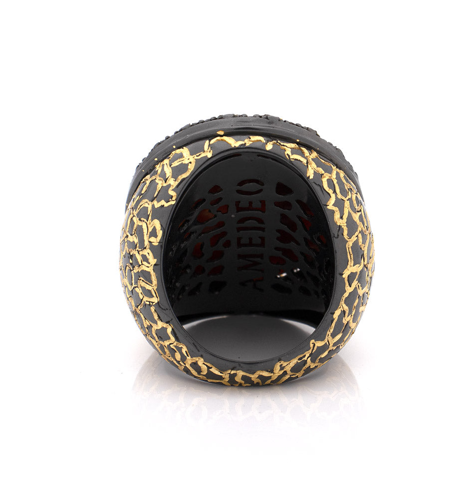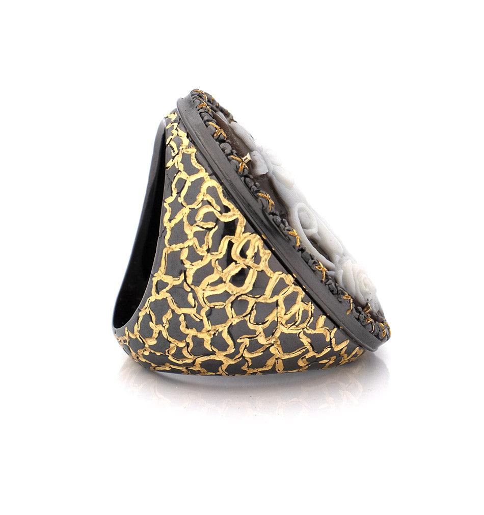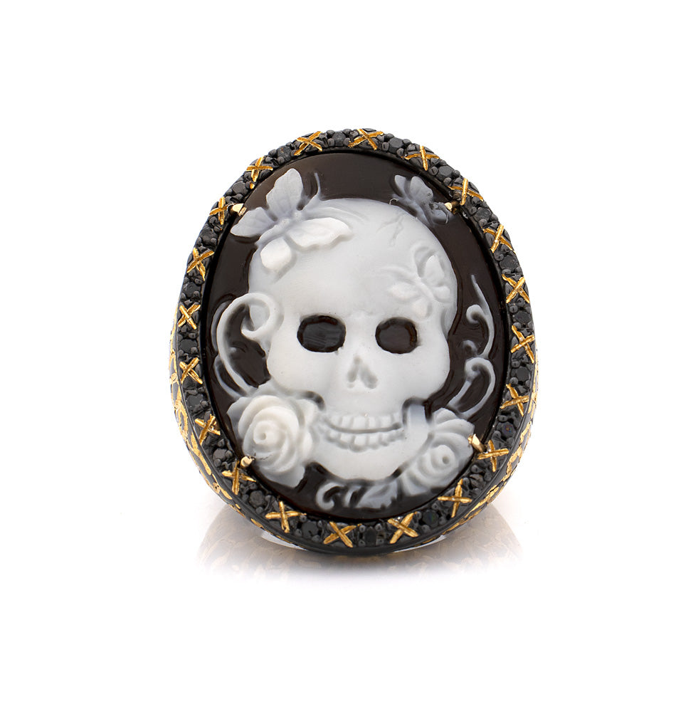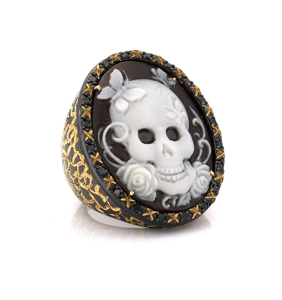 Memento Mori : un anello con cammeo in conchiglia di sardonica da 30 mm, intagliato a mano, che riflette il delicato equilibrio tra la fragilità della vita e la sua fugace bellezza. Il teschio, decorato con farfalle e incorniciato da dettagli raffinati, trasforma un simbolo di mortalità in un simbolo di rinnovamento e silenziosa eleganza. Incastonato in argento sterling con rodio nero e impreziosito da diamanti neri, il gioiello unisce una raffinata artigianalità a un profondo simbolismo. Più che un anello, è un promemoria per abbracciare la vita pienamente, trovando grazia e forza nella sua impermanenza e celebrando la bellezza trasformativa che esiste anche di fronte alla mortalità.