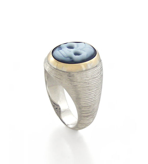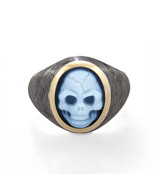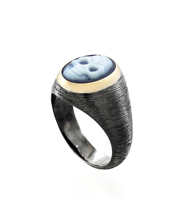 Il Mini "Skull" Gold Accent presenta un cammeo in agata da 12 mm intagliato a mano, che trasforma un delicato teschio in un'audace dichiarazione di individualità. Incastonato in oro giallo 18 carati e argento sterling, il pezzo fonde raffinata artigianalità con un lusso discreto. Piccolo nelle dimensioni ma di impatto sorprendente, è una celebrazione del dettaglio, dell'eleganza e del fascino intramontabile di un teschio reso con materiali preziosi: perfetto per chi apprezza un simbolismo audace in una forma raffinata.