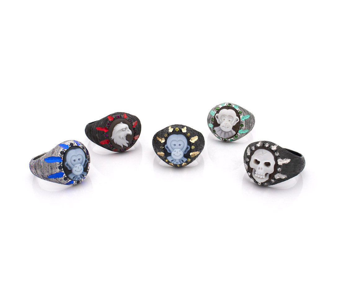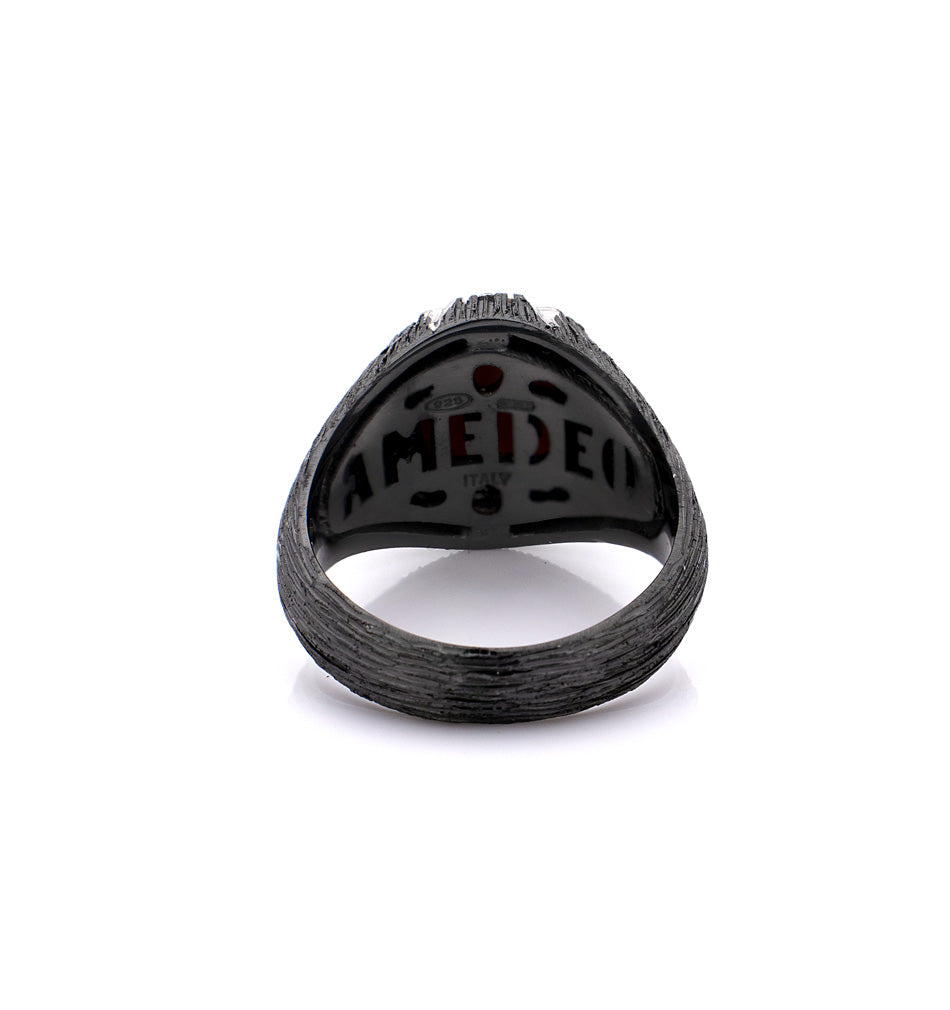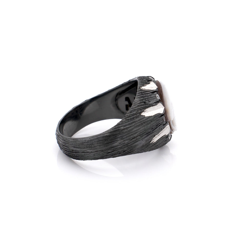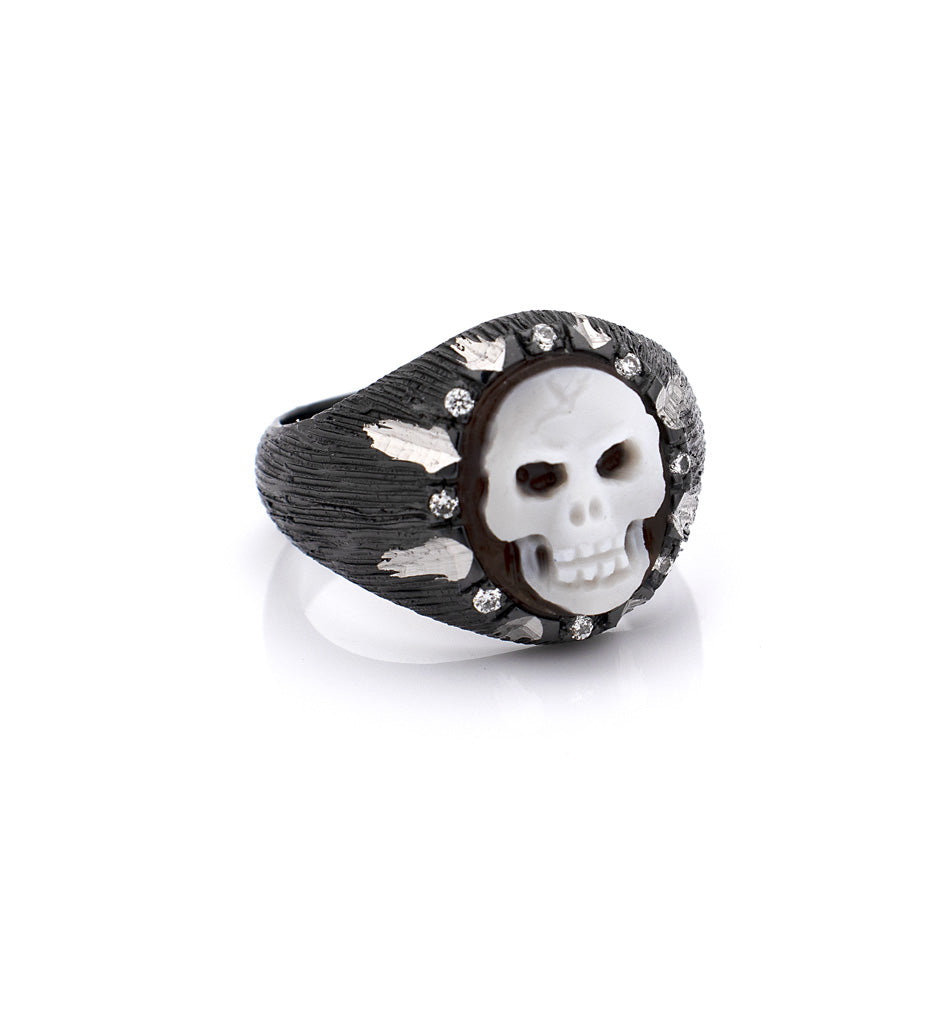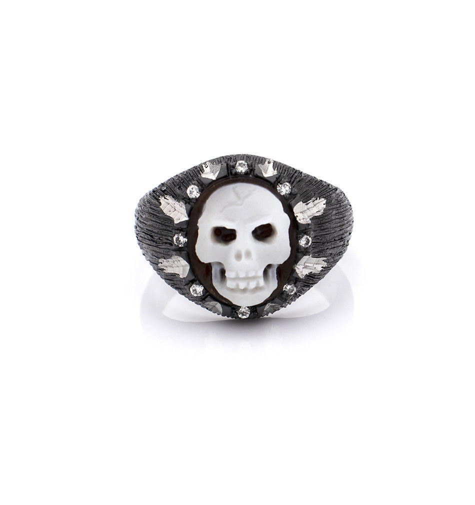 Denominato "SKULL" , questo anello con cammeo in conchiglia di sardonica da 12 mm, intagliato a mano, presenta un sorprendente teschio, incastonato in argento sterling con placcatura in rodio nero e impreziosito da diamanti bianchi. Compatto ma di grande impatto, il pezzo unisce una meticolosa lavorazione artigianale a un simbolismo audace. Il teschio incarna individualità, forza e stile senza tempo, rendendo l'anello più di un semplice gioiello: è una dichiarazione di sicurezza, carattere e raffinatezza.