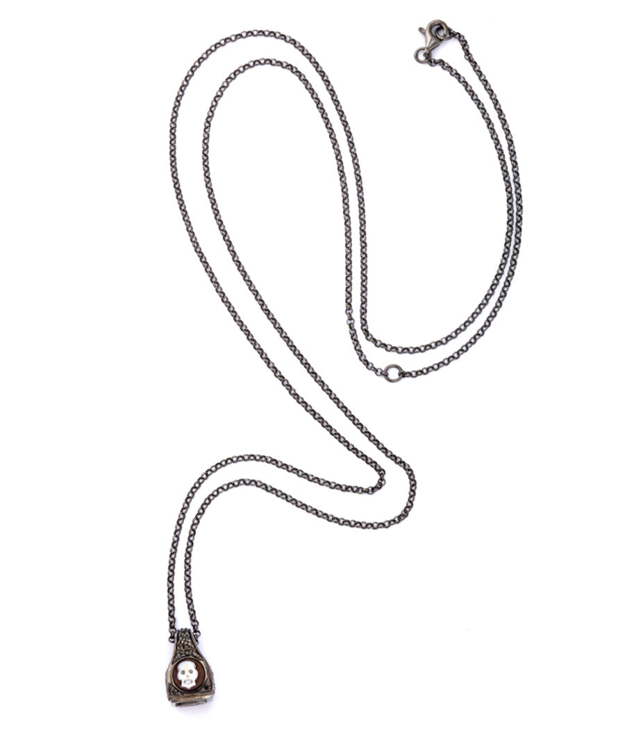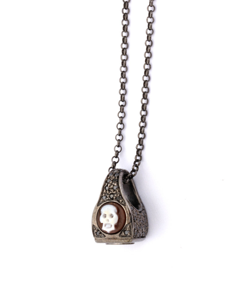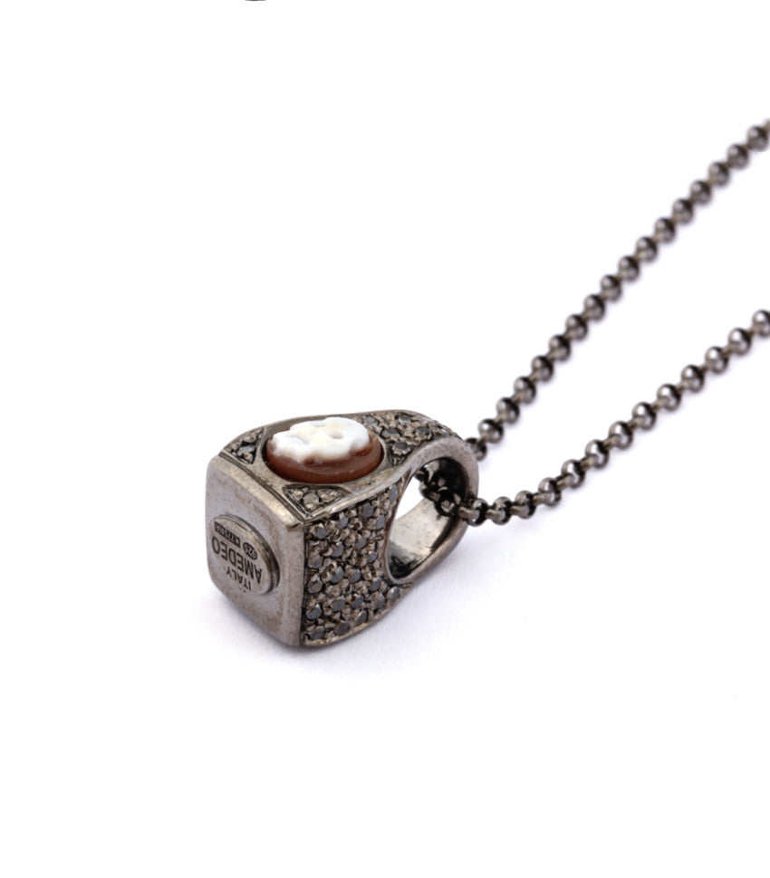 Teschio in miniatura : un cammeo in conchiglia di sardonica da 6 mm intagliato a mano che trasforma un minuscolo teschio in un audace emblema di individualità e presenza. Incastonato in argento sterling con placcatura in rodio nero e impreziosito da diamanti neri, il pezzo unisce una meticolosa lavorazione artigianale a una sottile raffinatezza. Di piccole dimensioni ma di impatto sorprendente, è una raffinata dichiarazione di stile che abbraccia la bellezza dei dettagli, il fascino della mortalità e il potere di un'eleganza sobria.