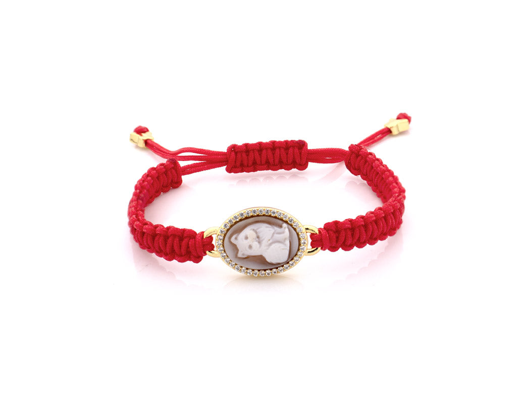 Un tenero gattino rannicchiato in un delicato cammeo intagliato a mano. My Little Kitty è un braccialetto rosso intrecciato, pieno di affetto e fascino, perfetto per gli amanti degli animali e le bambine che adorano i loro amici pelosi.