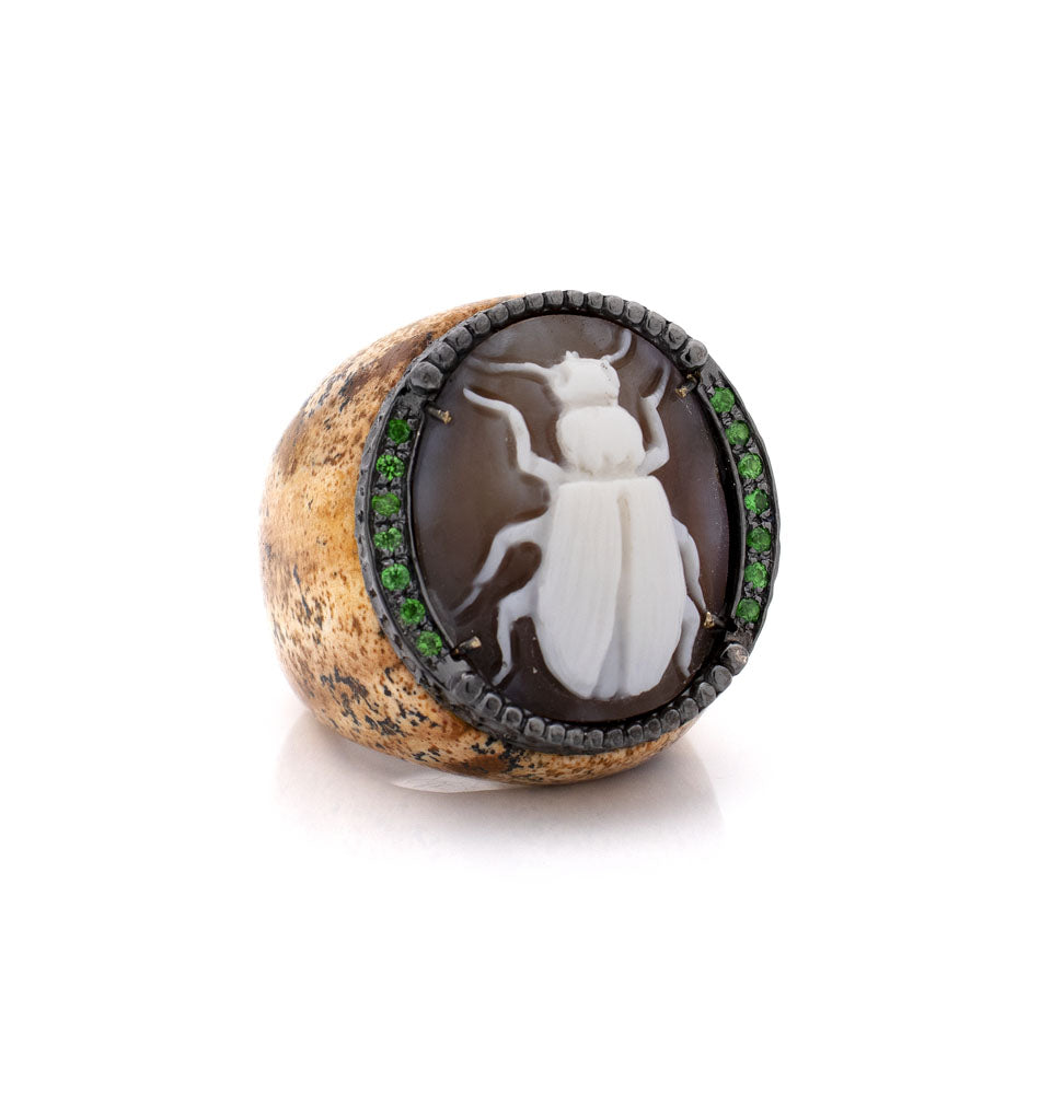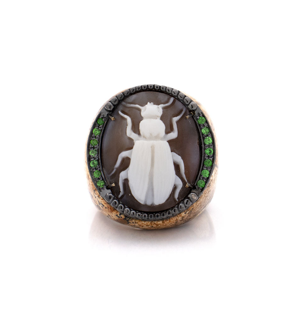 Il cammeo centrale raffigura uno scarabeo bianco meticolosamente scolpito, che emerge in netto contrasto con lo sfondo scuro. Incorniciato da un cerchio di pietre verdi vibranti, questo gioiello evoca la rigogliosa fertilità della Valle del Nilo, dove la vita fioriva e nascevano i segreti dell'aldilà.