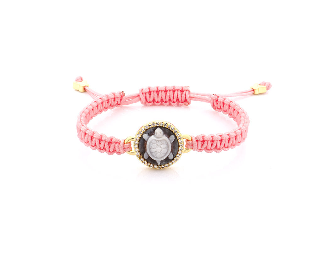 Ecco la tua Amica dell'Oceano , una dolce tartaruga intagliata in un delicato cammeo. Incastonata in un delicato bracciale intrecciato rosa, questa dolce creatura marina è simbolo di saggezza e calma, perfetta per le ragazze che amano gli animali e la magia dell'oceano.