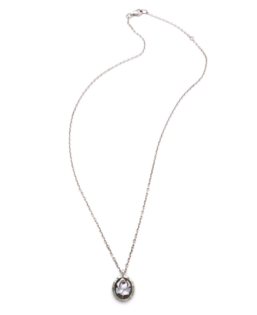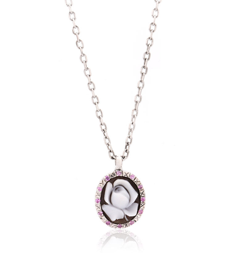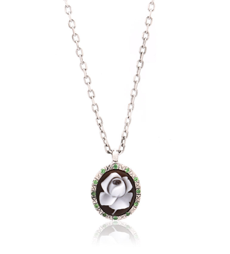 In un luogo avvolto nel mistero, dove la luce filtrava attraverso vetrate colorate, nacque un pendente diverso da tutti gli altri. Una delicata rosa, scolpita nel più morbido dei cammei, brillava di una radiosità interiore, baciata dal luccichio di minuscole pietre preziose.