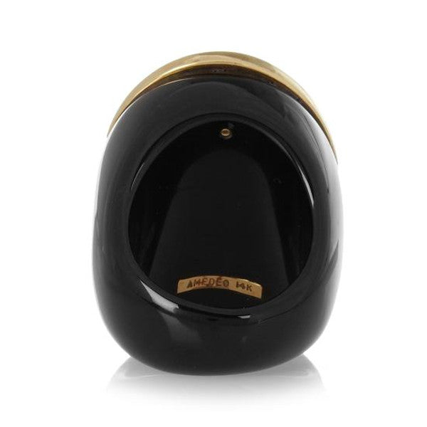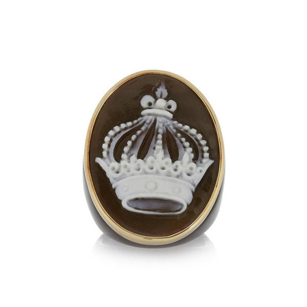 Vi presentiamo un vero capolavoro: l'anello con cammeo Crown, un pezzo regale ed elegante che coniuga tradizione e lusso moderno. Intagliato a mano in Italia, questo squisito anello con cammeo presenta una corona dettagliata, sapientemente incastonata su una base liscia in resina scura e incorniciata da un bordo dorato. L'intricata lavorazione artigianale della corona evoca un senso di regalità e raffinatezza, rendendolo un'aggiunta senza tempo a qualsiasi collezione di gioielli.