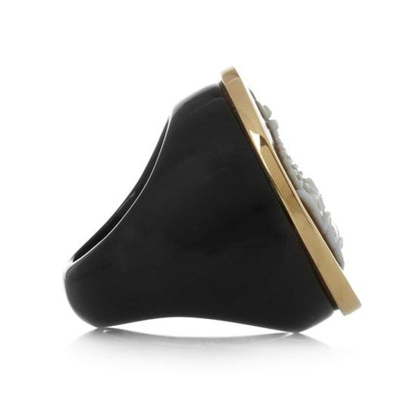 Questo anello è più di un semplice accessorio: è una dichiarazione di forza e individualità. La tecnica del cammeo, tramandata di generazione in generazione, mette in risalto l'abilità dell'artigiano nel creare immagini realistiche e dettagliate, mentre il design moderno con la sua elegante fascia nera lo rende perfetto sia per un abbigliamento formale che casual.
