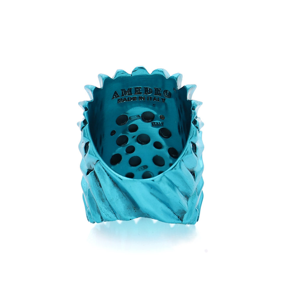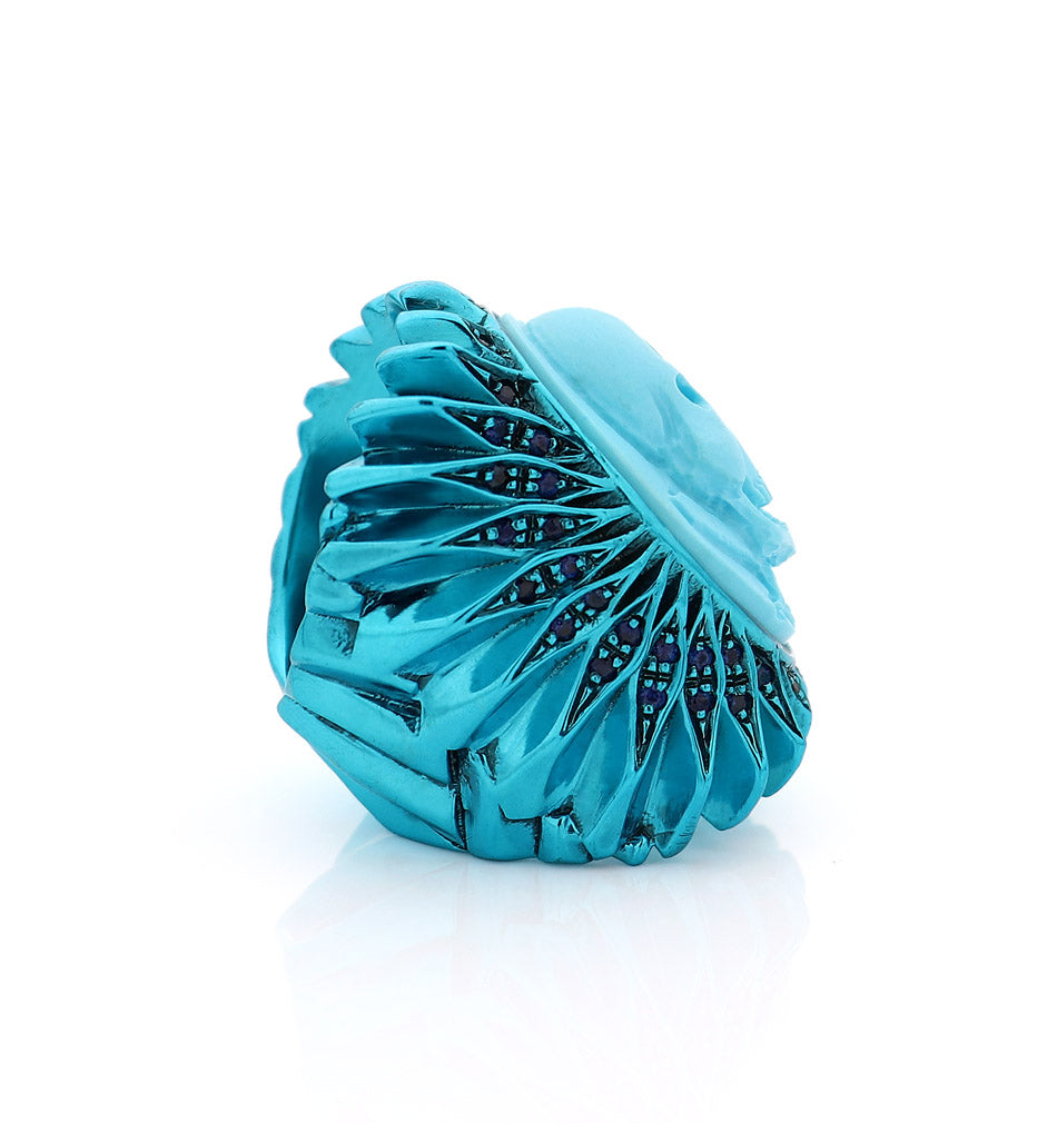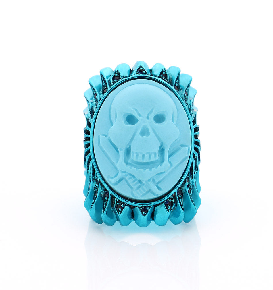 Intitolato "Rhapsody in Blue" , questo cammeo in conchiglia turchese da 25 mm, intagliato a mano, raffigura un teschio che cattura lo spirito espressivo e fluido di una rapsodia musicale. Incastonato in argento sterling e impreziosito da zaffiri blu, il gioiello rispecchia l'intensità, l'emozione e il movimento drammatico del suo omonimo: una celebrazione del ritmo, dell'improvvisazione e degli alti e bassi dell'esistenza. Audace ma elegante, il teschio diventa simbolo di individualità e presenza, invitando chi lo indossa ad abbracciare le passioni della vita, la sua imprevedibile bellezza e l'armonia che si trova nei contrasti.