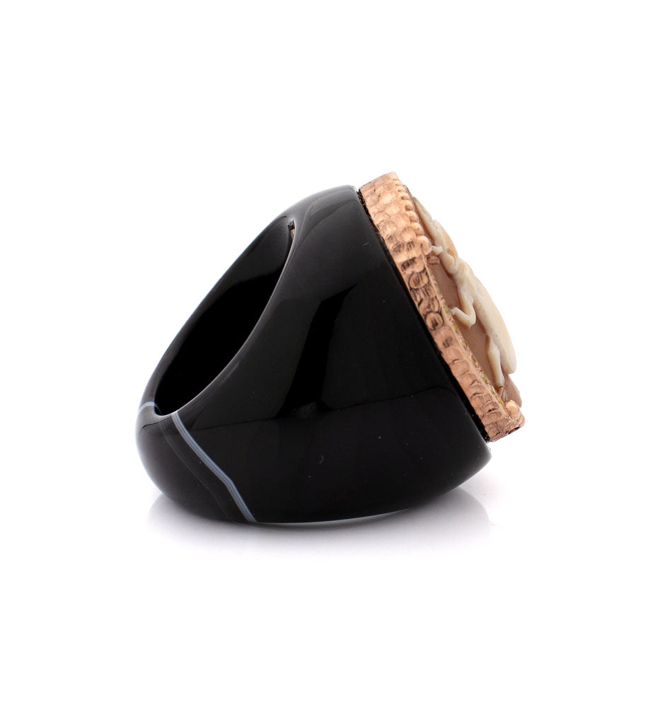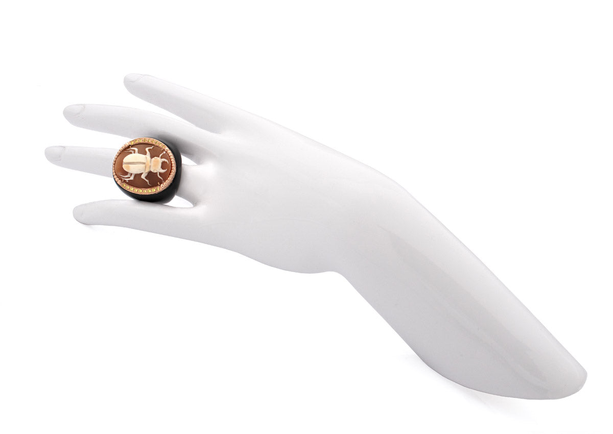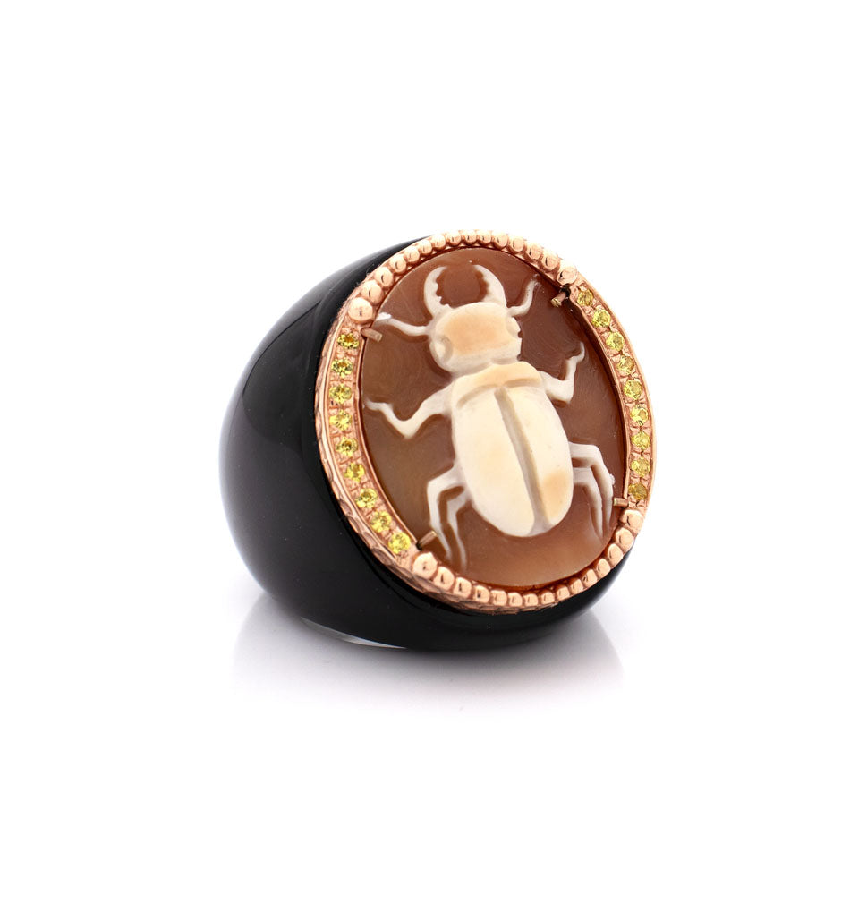 Vi presentiamo il nostro anello con cammeo raffigurante uno scarabeo , una straordinaria fusione di tradizione e innovazione, che rende omaggio alla migliore artigianalità italiana. Questo pezzo unico è scolpito a cammeo, un'antica tecnica che richiede una precisione meticolosa, e raffigura uno scarabeo, simbolo di rinascita e protezione.